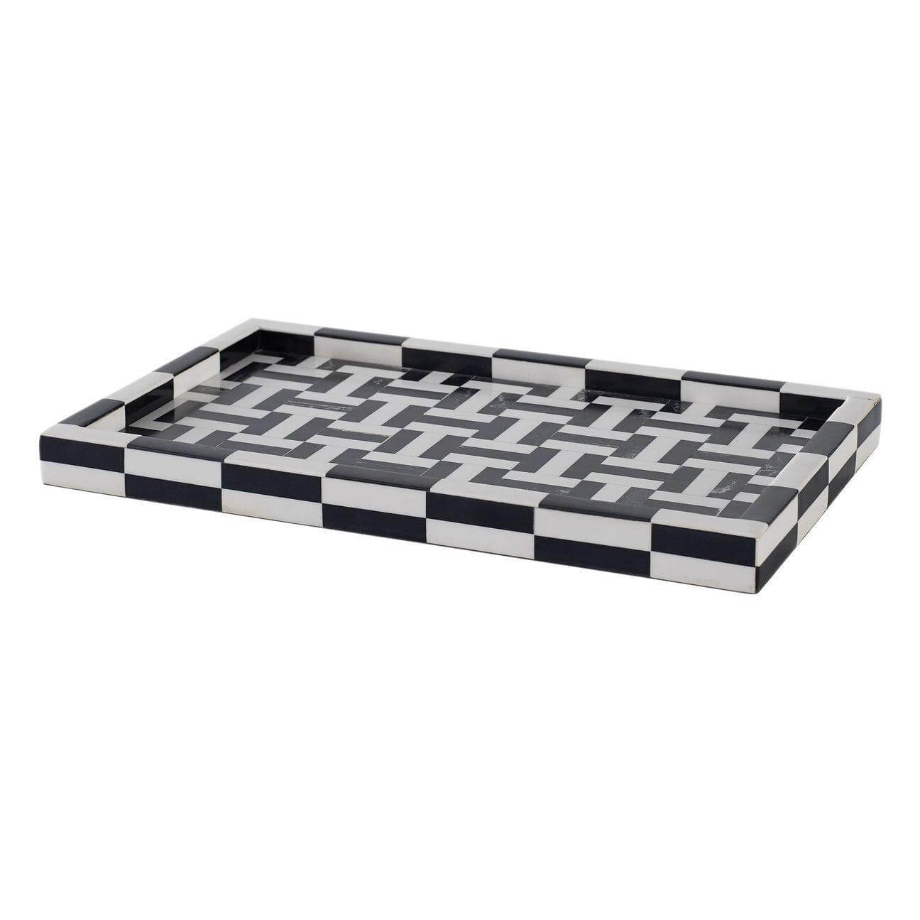 Hermes White Black Bone Inlay Serving Tray. A large black and white decorative bone and resin tray featuring a playful geometric pattern.