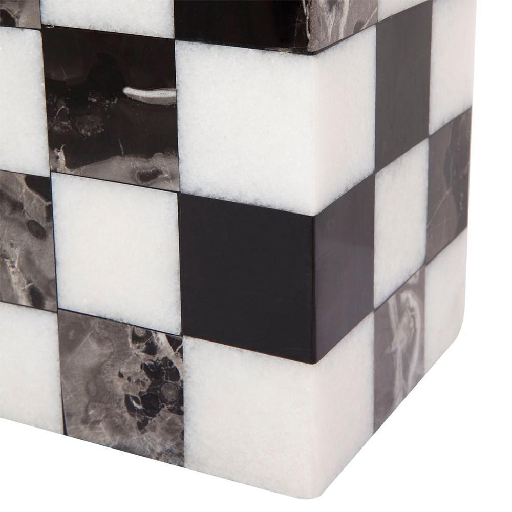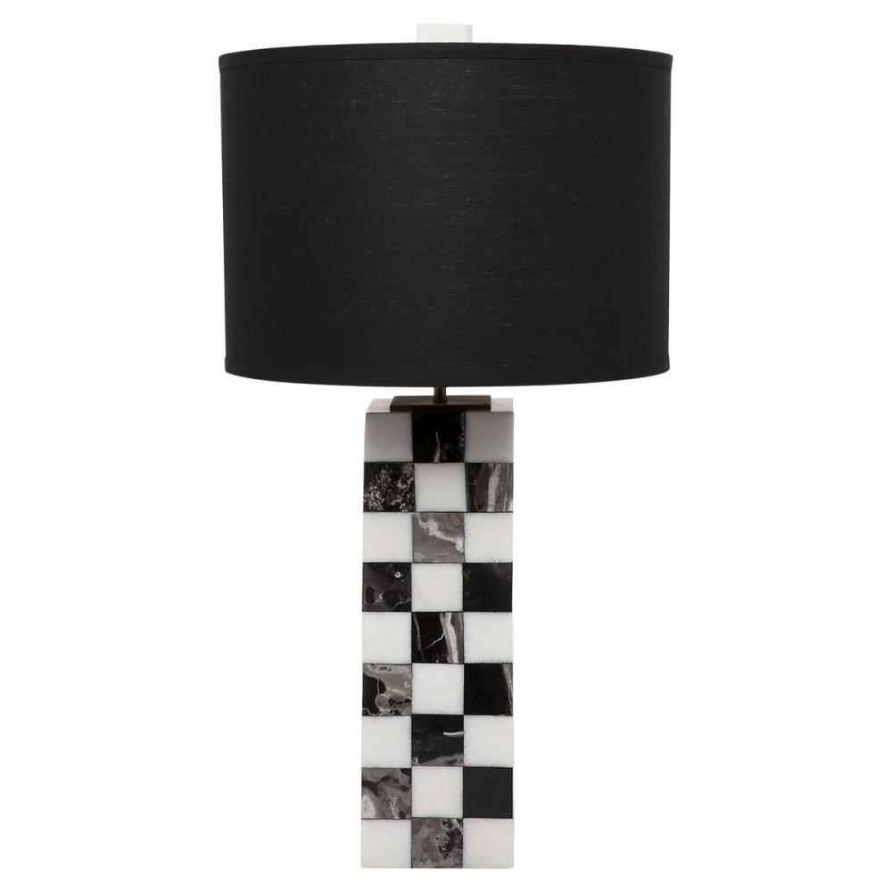 The Hillcrest collection extends to lighting with these dramatic solid marble black lamps in a checker motif. With black linen round drum shade.