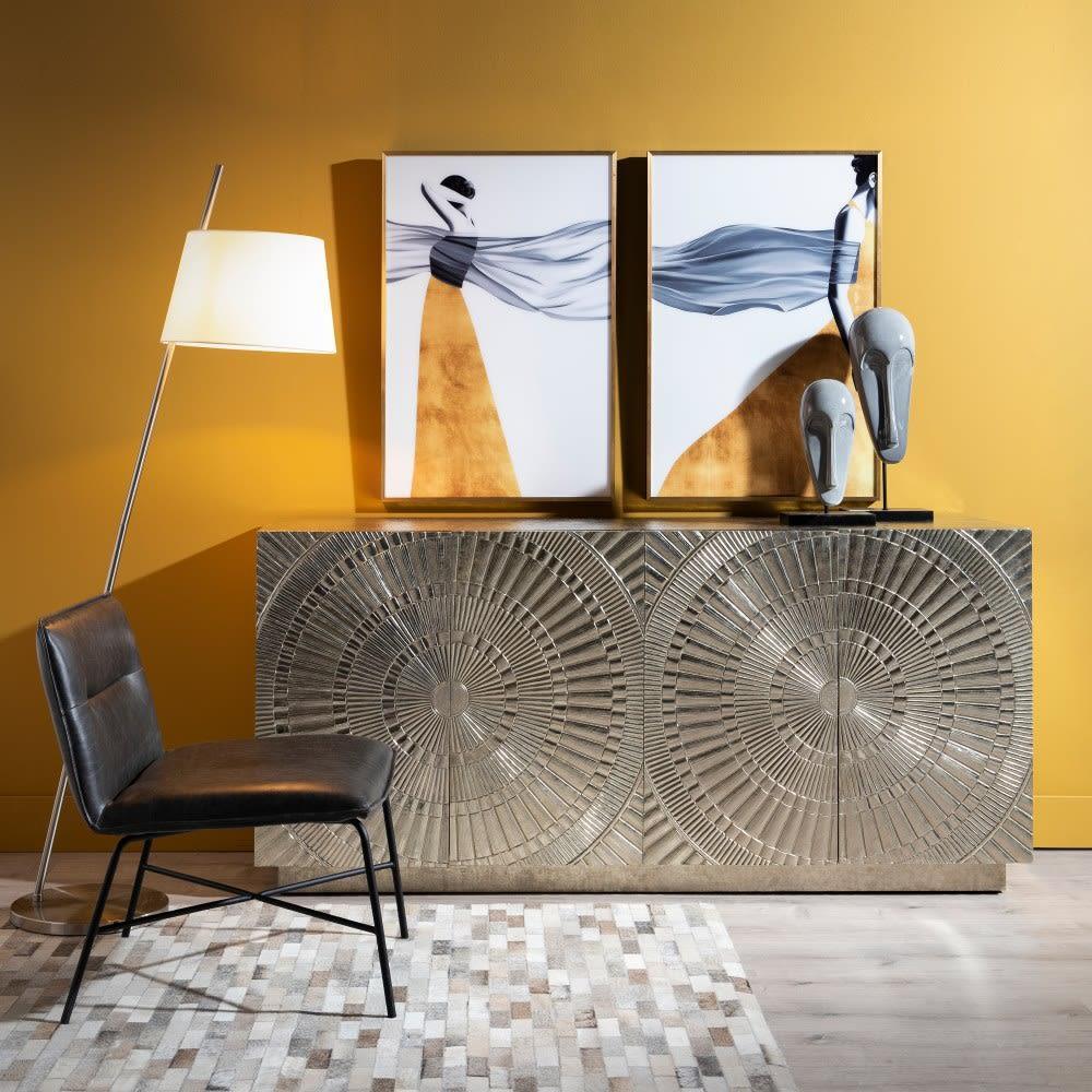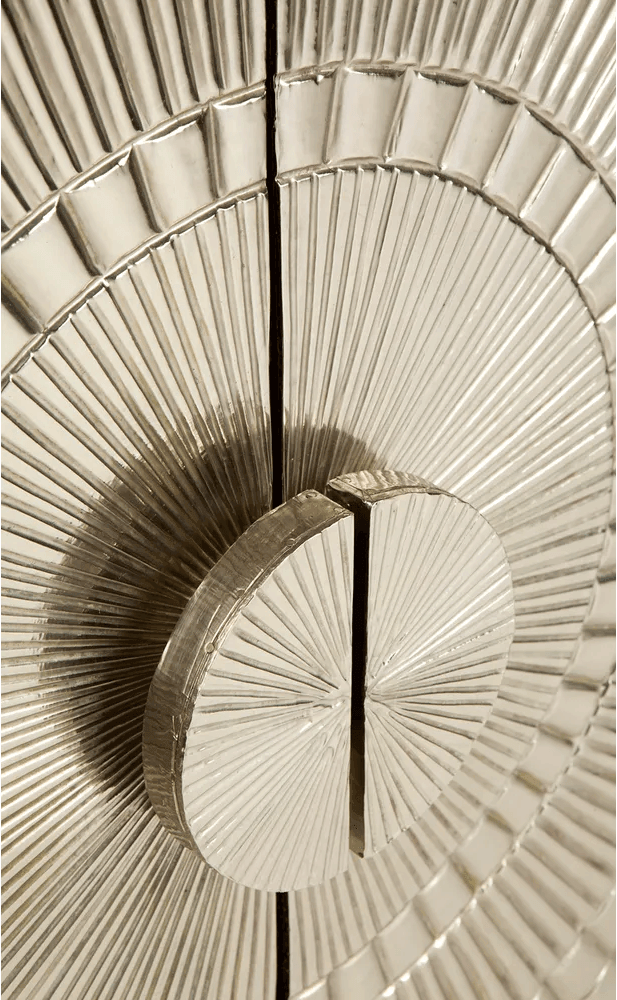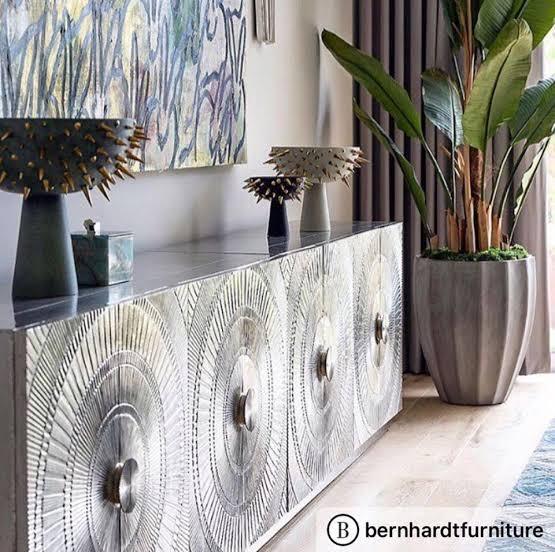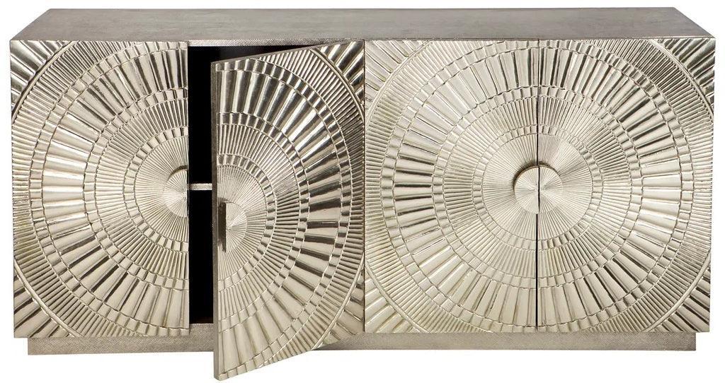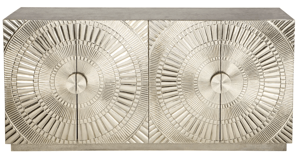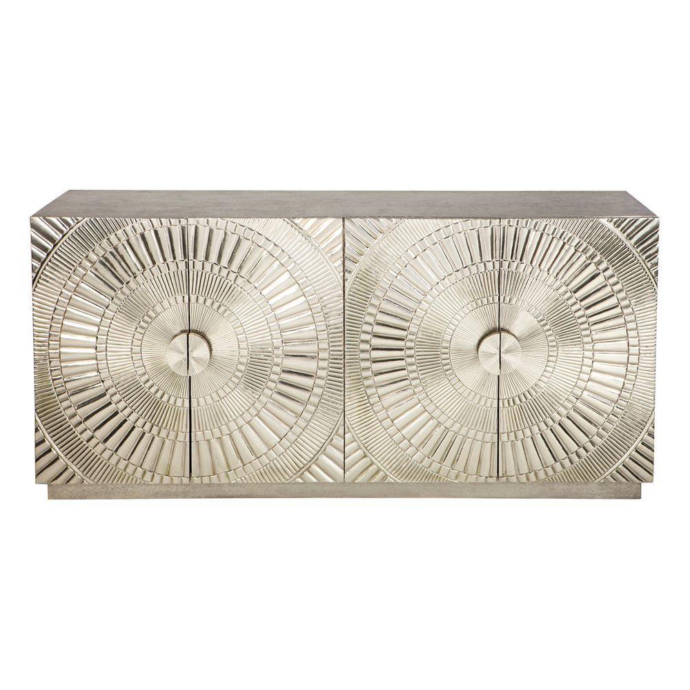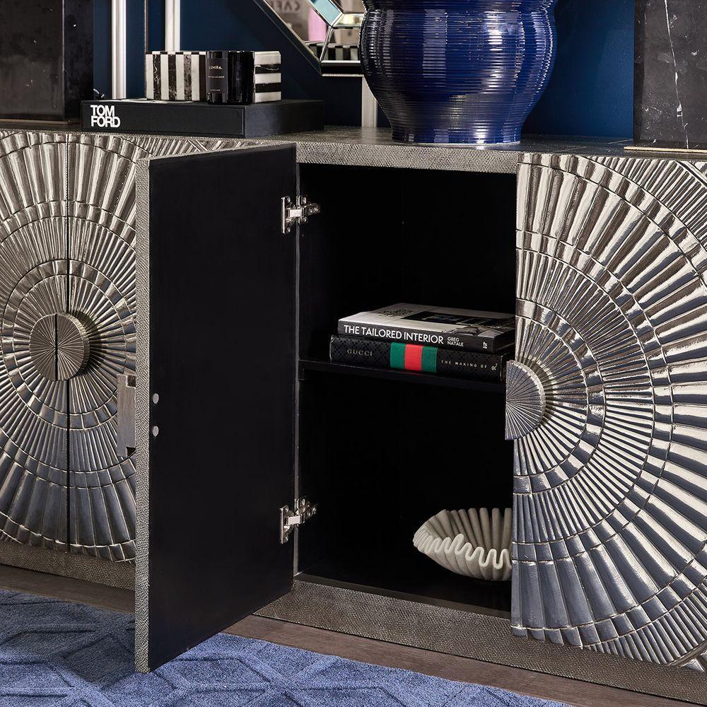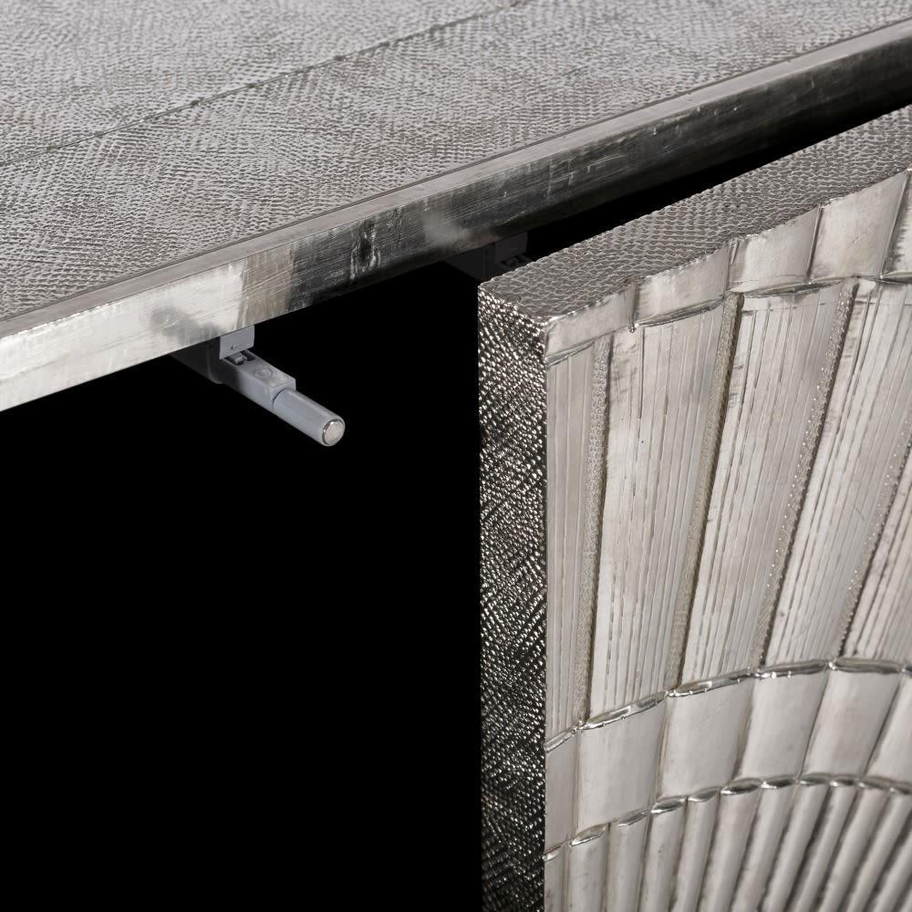 Horchow Nickel Buffet 182cm nickel clad four door buffet. Top and sides are finished in a plain nickel clad, whilst push-button doors are finished with a grooved pattern. Our Favourite designer piece. No two items are alike, the beauty of these individually handcrafted products lie in its imperfections. Please consider carefully that these products are suitable for your market. Extended exposure to direct sunlight may cause bubbling to appear in the metal surface. Safety Anchors Recommended and Included Assembled.