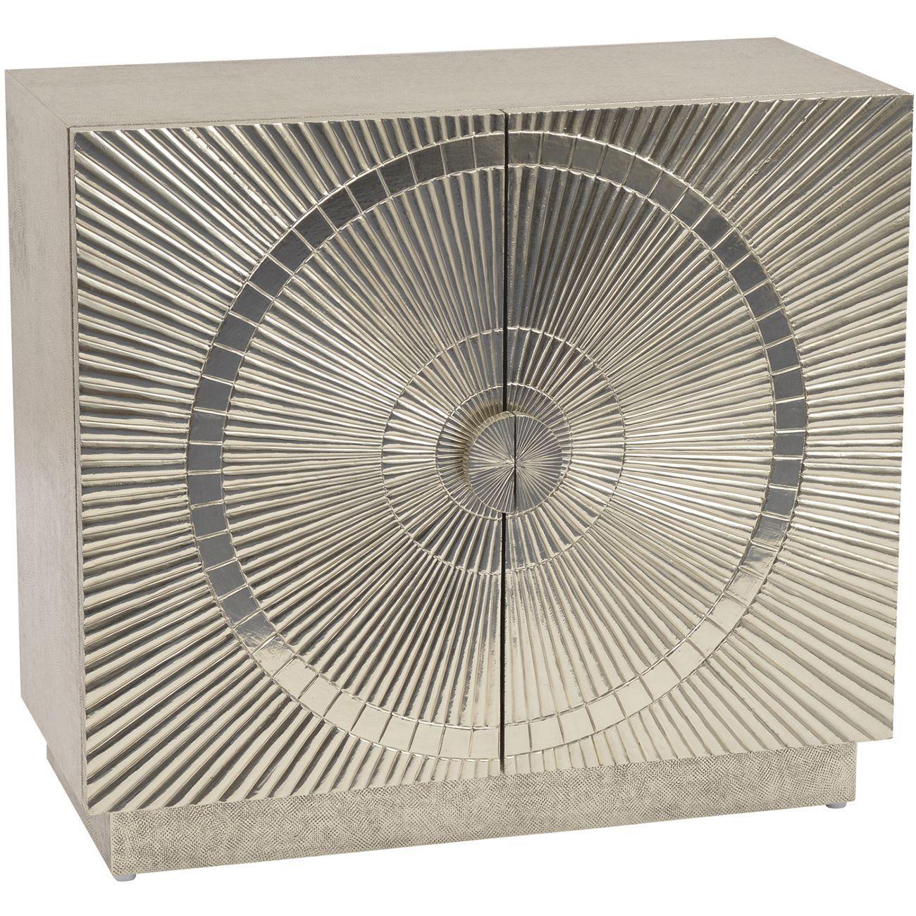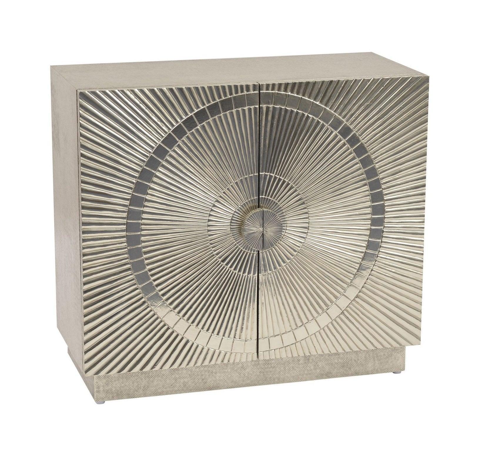 This statement cabinet has been expertly handcrafted using hammered sheet metal, laid over a solid wood frame. Featuring two elegantly patterned doors and inner shelving, this stylish storage unit is as beautiful as it is practical. An expertly handcrafted and elegantly patterned two-door cabinet. This silver cabinet will safely store away your valuables on one of its one shelf.