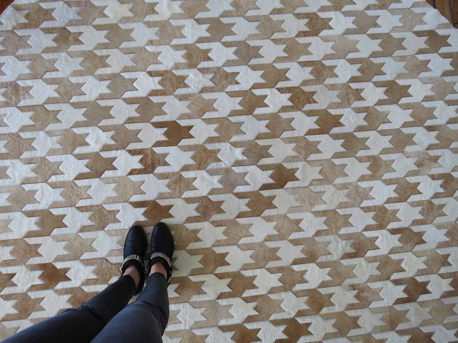 Our Round Houndstooth Heather Patch Hide Rug Design is made using only premium, high quality hides, and can be customized in any size and shape. These cow-hide rugs are naturally durable, resistant to liquid, dirt and stains and are easy to clean with occasional light vacuuming with the low suction setting and no spinning bristles or sweep with a clean broom. Spots and spills are no problem, just clean with a damp cloth, being careful not to soak the hide. The rug has a durable felt backing on the complete underside to protect your rug for generations. Please read the rest of the care instructions in the “Rug Care” section of the website.