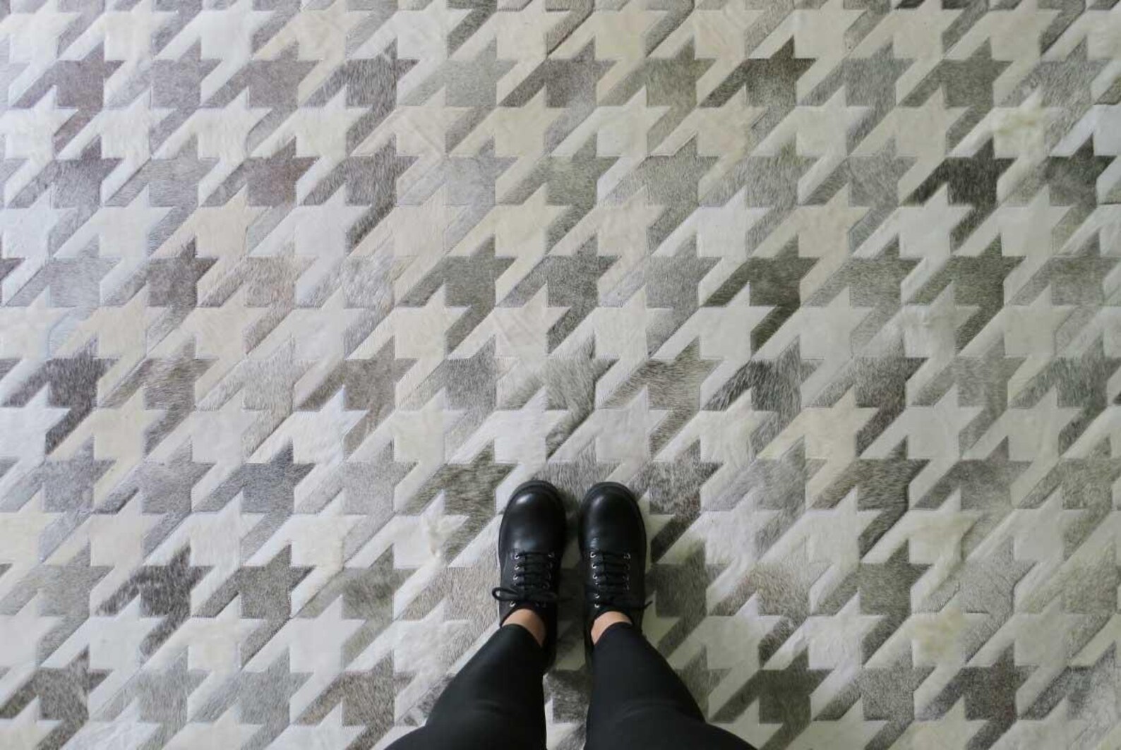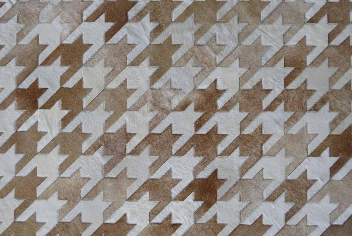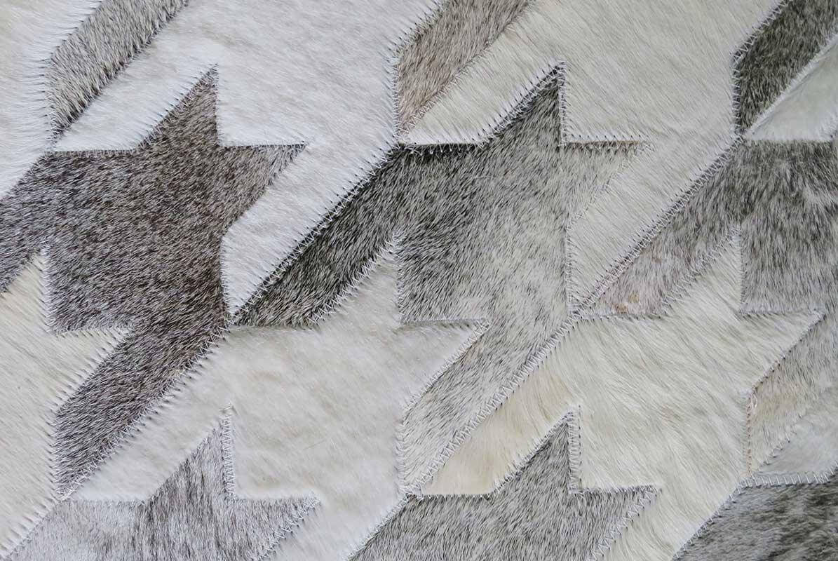 Complete your luxurious home with a classic, timeless and always fresh Houndstooth pattern in heather gray and soft, creamy white. Using only ethically sourced high quality natural hides and crafted exclusively by exceptionally skilled leather experts, our cowhide patchwork rugs are finished with subtle and resistant zigzag stitching. This durable leather area rug keeps its natural soft suede on the back, giving it incredible grip to your floors without an under pad.