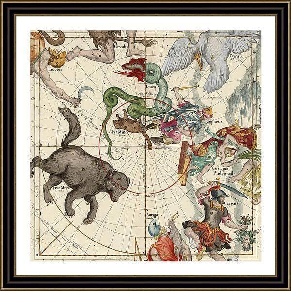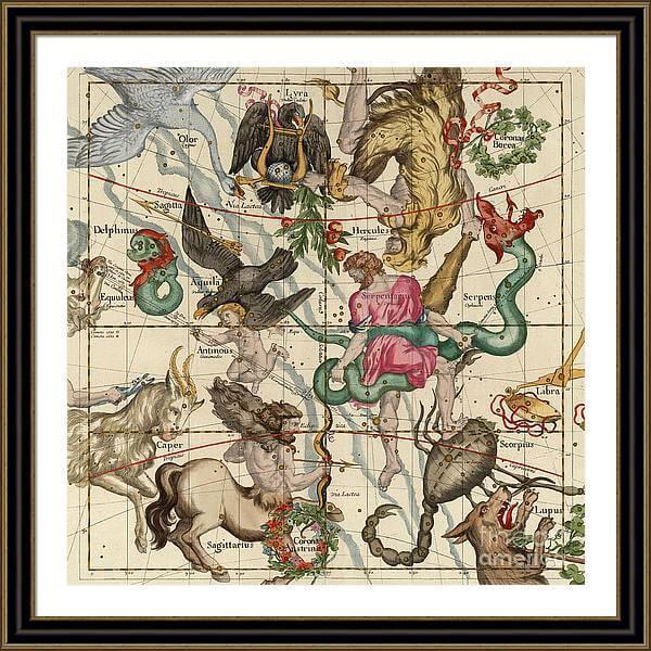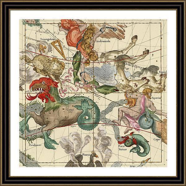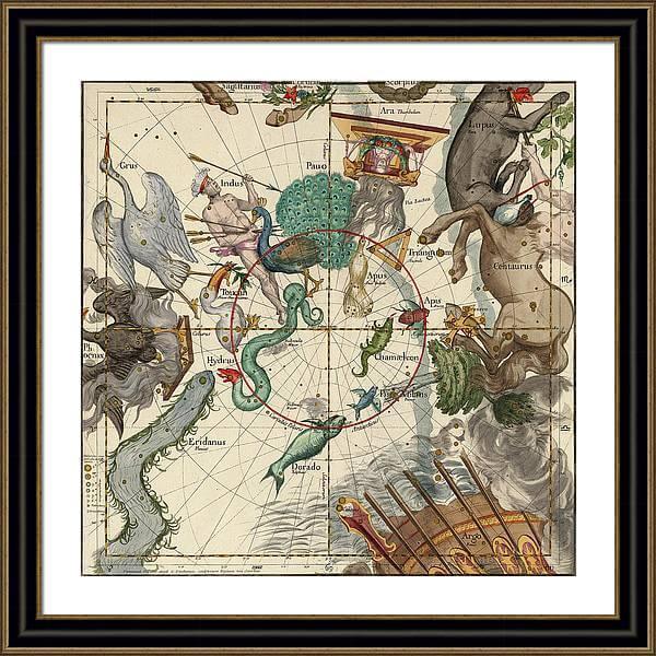 Our art prints are produced on acid-free papers using archival inks to guarantee that they last a lifetime without fading or loss of color. All art prints include a 2 inch standard white matt border with ready to hand framer and glass front. Constellation map from the star atlas, ‘Globi Coelestis in tabulas planas redacti descriptio’, by Ignace-Gaston Pardies, 1693. Engraving by G. Vallet. South pole, North Pole, Vertcal Equinox, Winter Solstice.
