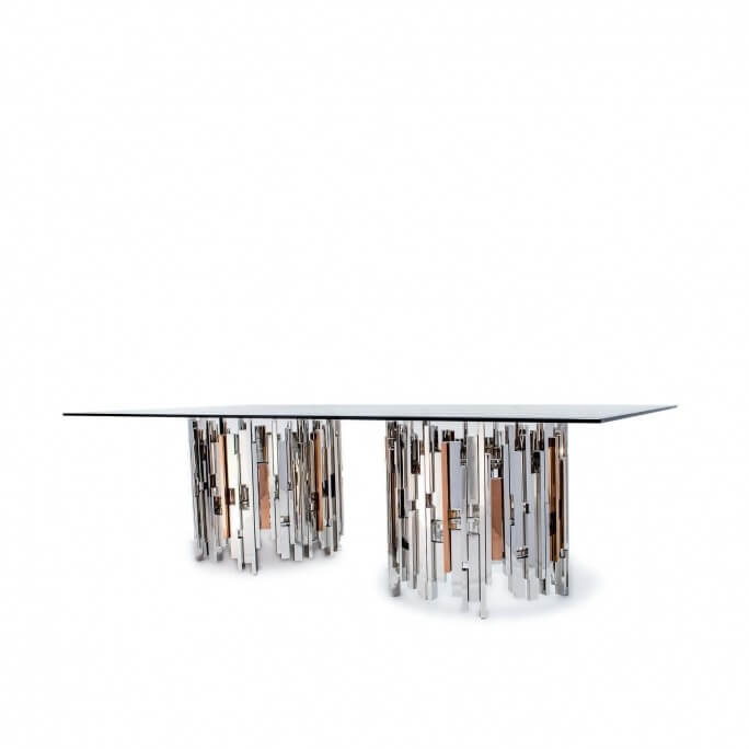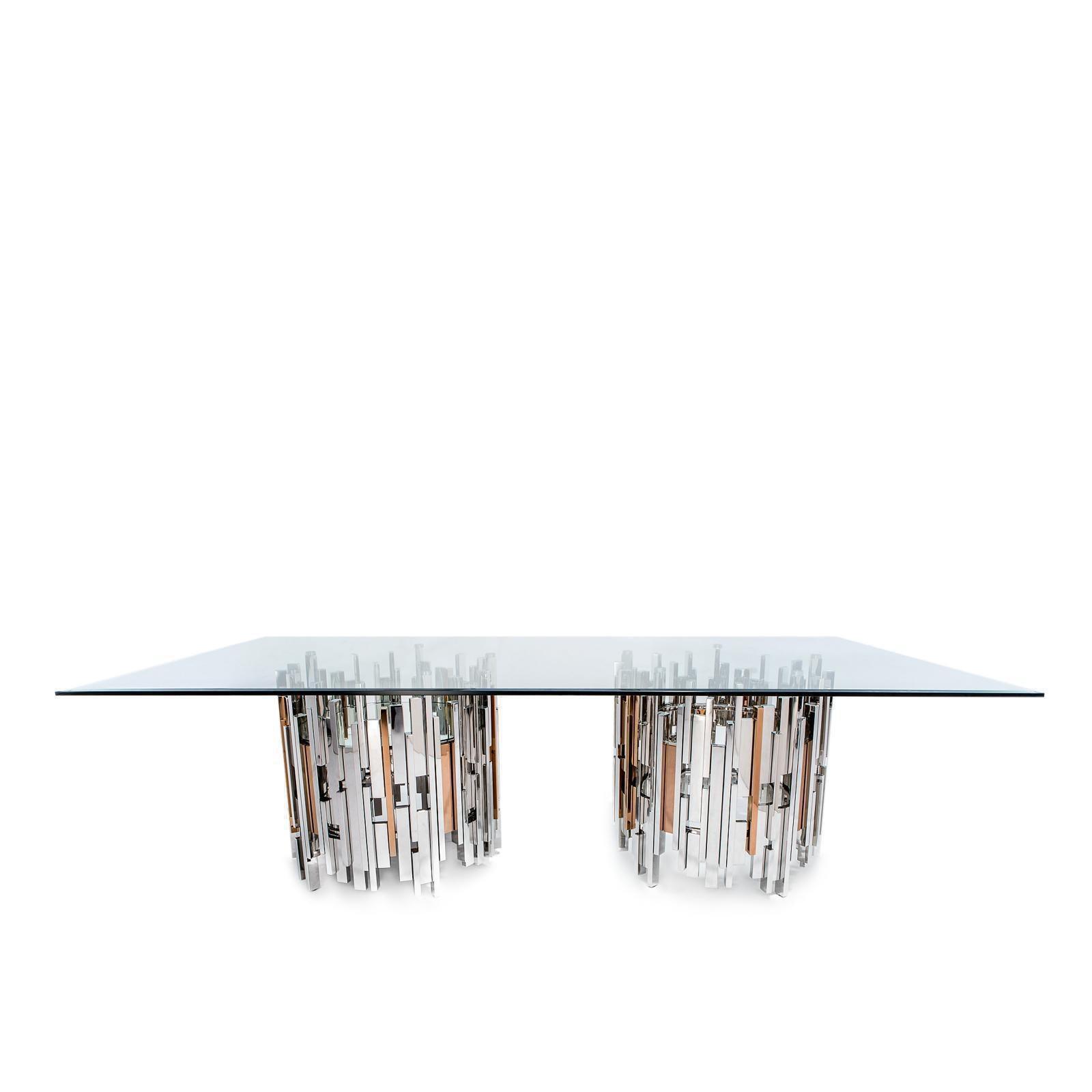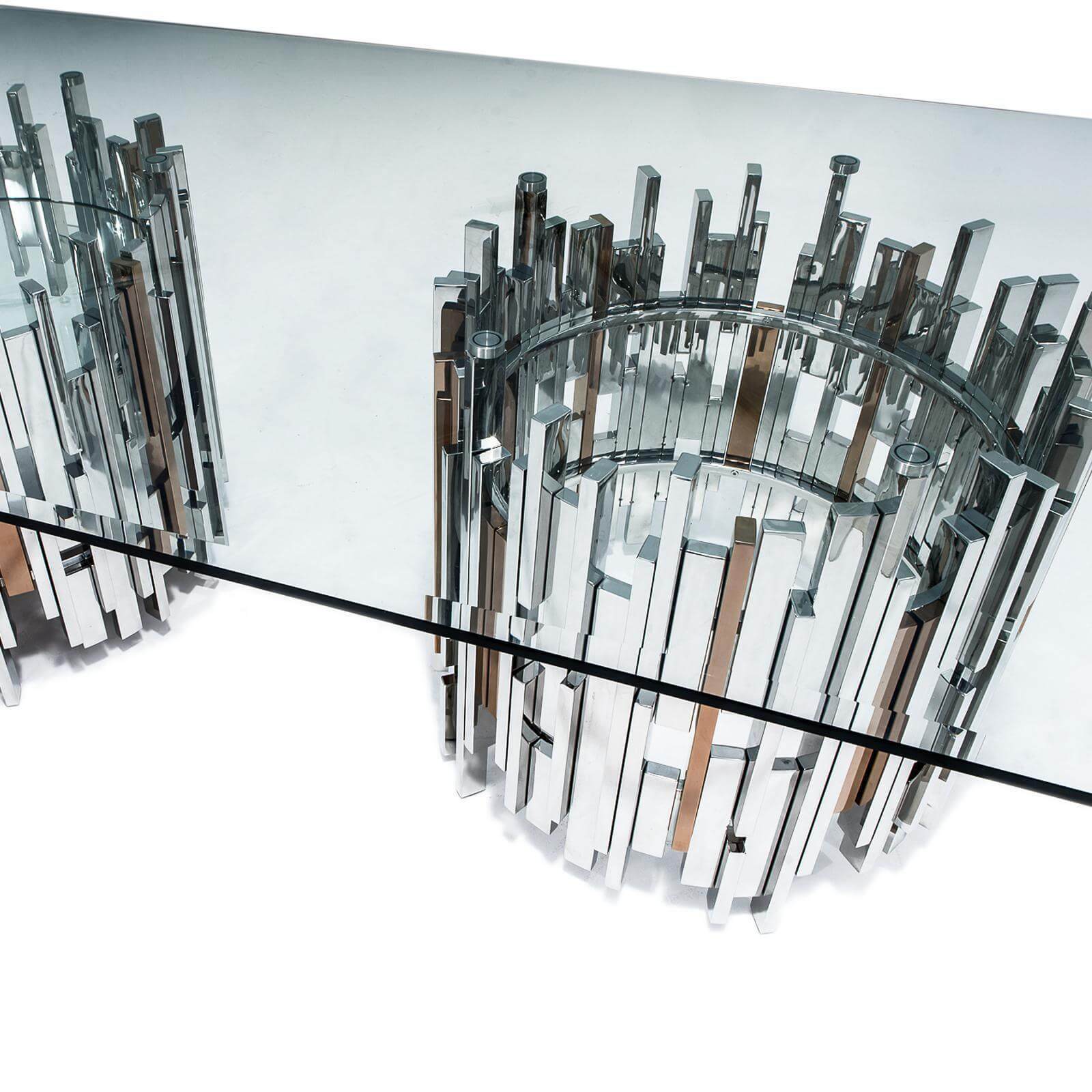Illusion modern rectangular dining table with a polished chrome stainless-steel structure that has a main silver color complimented with delightful gold touch in few areas. The top has a mirrored glass which exposes the eye-opening contemporary design of the Illusion set. The large table seats 10-12 guests comfortably.
