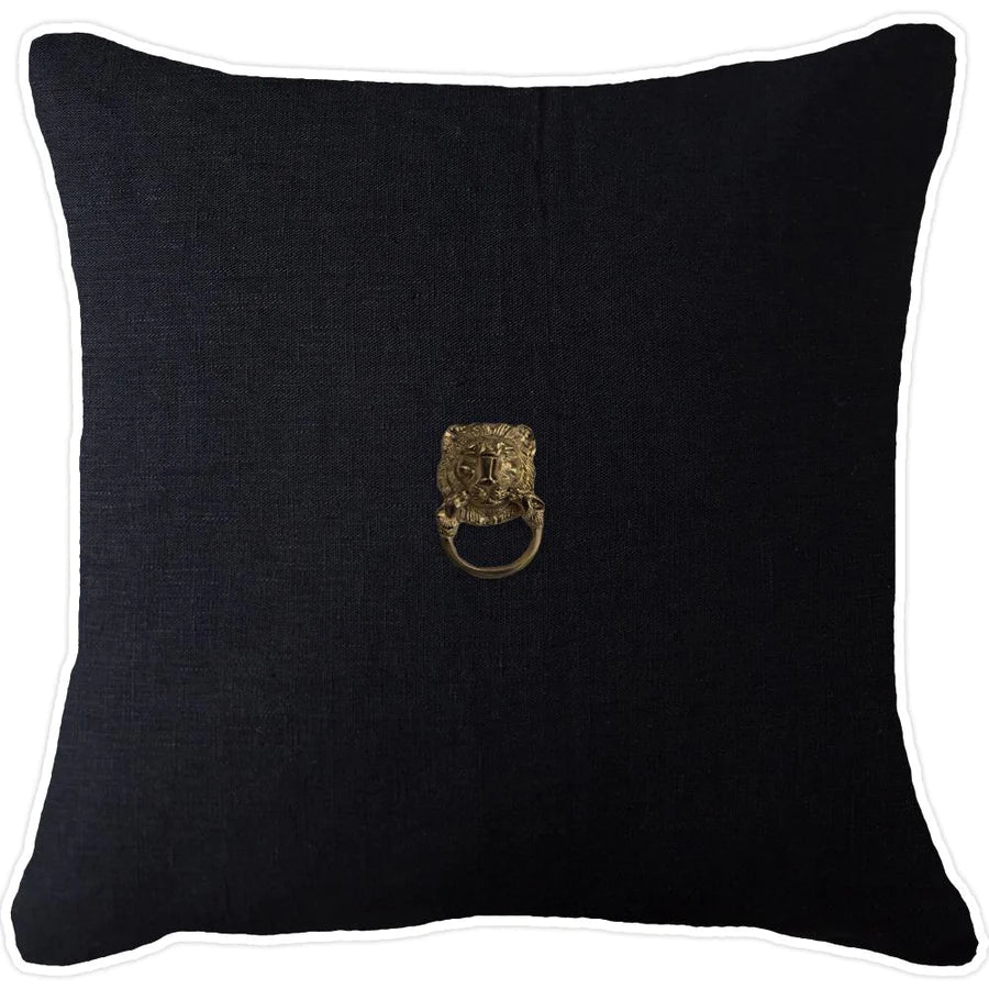 The stunning Metal Lion Head feature cushion is an Urban lovers dream! It consists of a generous 55 x 55 cm Piped Linen Lounge cushion with the Lion head embellishment stitched on to the front. This cushion comes with a feather insert for a plump and comfortable cushion, that sits beautifully. They are all French seamed and come with coconut buttons—with a spare in the seam.