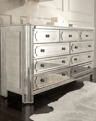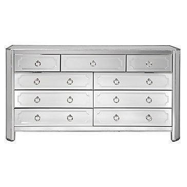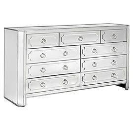 This mirrored six drawer dresser will add a more glamorous and sophisticated appearance to your. This silver mirrored 6 Drawer Dresser will add a more glamorous and sophisticated appearance to your bedroom. It is made of solid wood with mirrored finish. All drawers have Grey interior with polished ring handles and metal side rails for smooth motion of opening/closing.