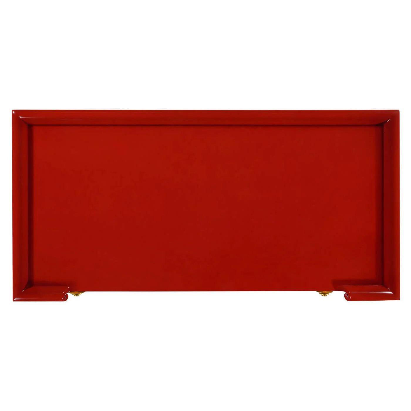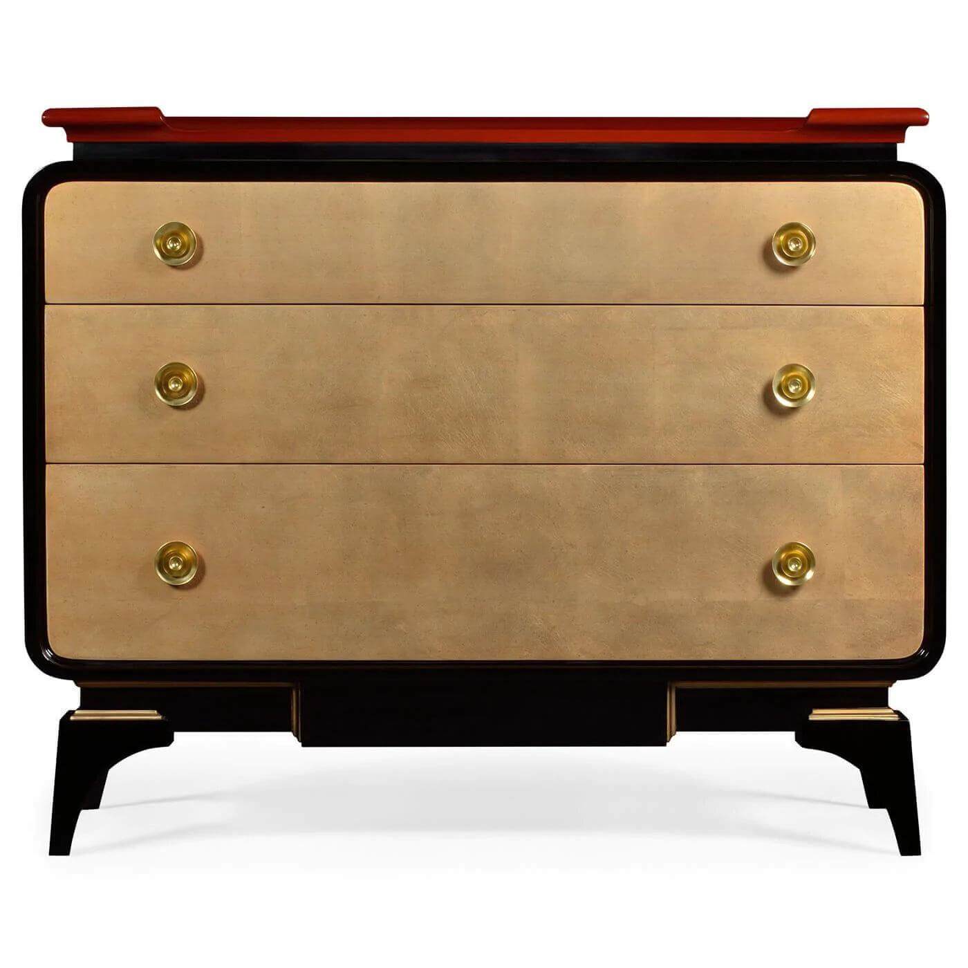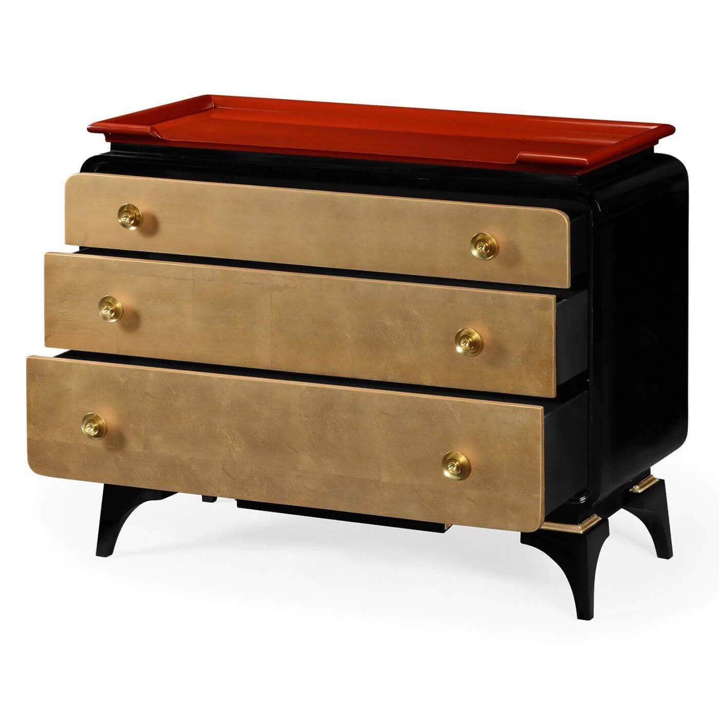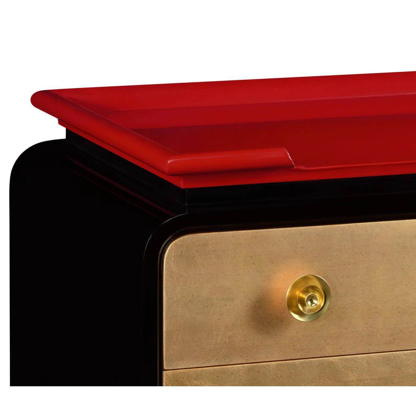 Mid Century Imperial red lacquered chest of drawers with a tray shaped top, set above a black lacquer chest, with antique gold-leaf gilded front drawer and mid-century brass handles. Made of solid hardwood in black lacquer finish.