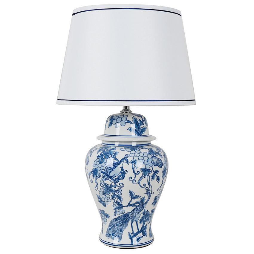 Our Peacock ginger jar-style table lamp is an elegant décor piece, with a stunning hand painted design of flowers and birds.