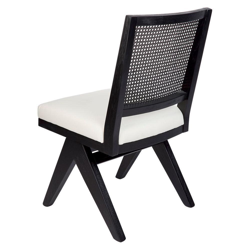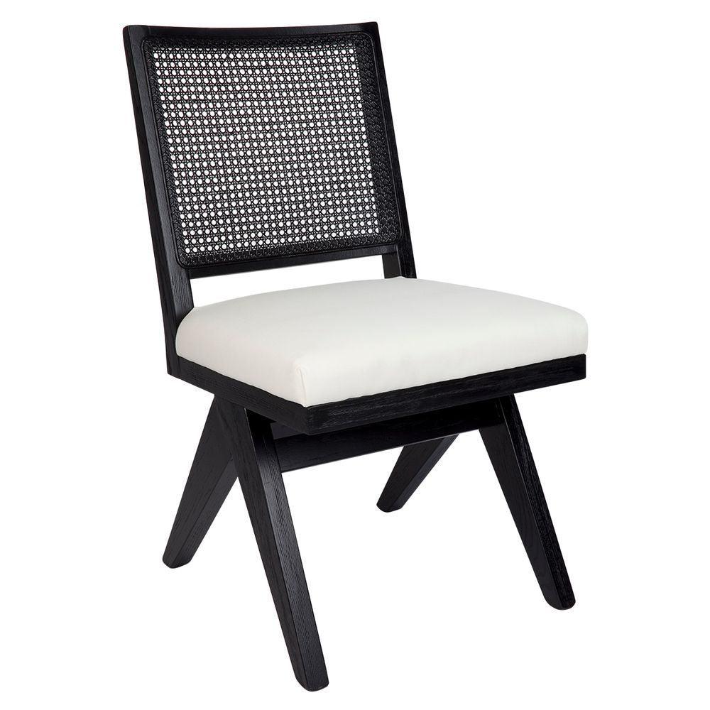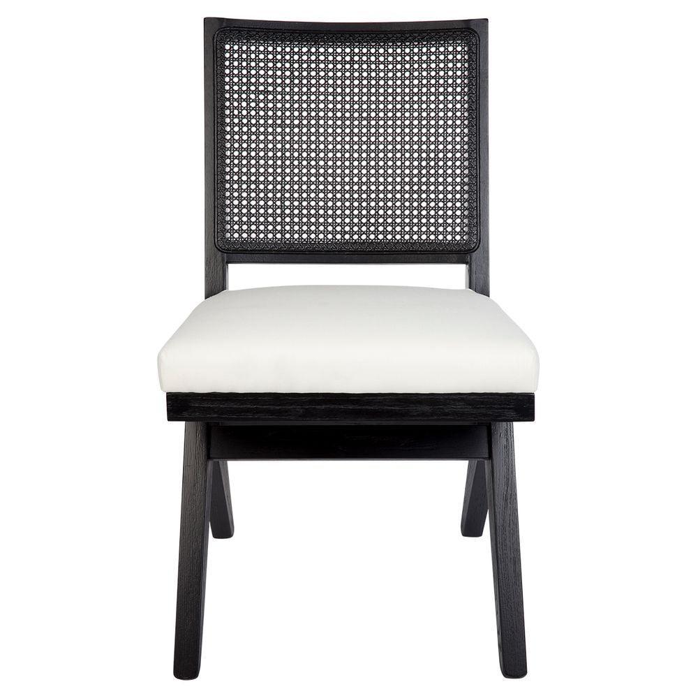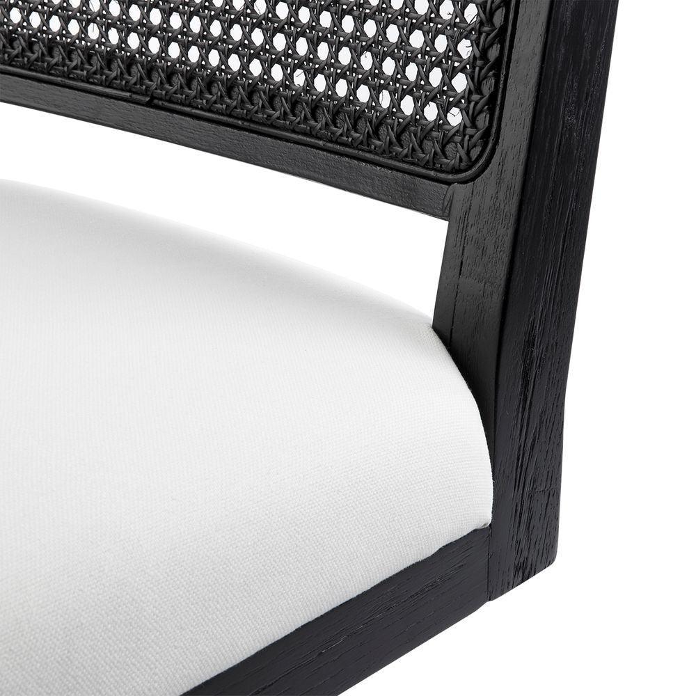 Black dining chair upholstered in a white linen cushioned seat with a black cane back rest and black painted oak legs