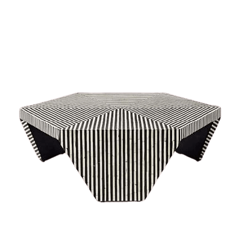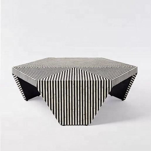 The Indigo hexagon coffee table is a distinctive statement piece in geometric and monochrome accents. Elegant and bold, this traveler inspired coffee table is crafted from bone inlay in black and white tones. Its hexagonal top features a likewise pattern that creates a coordinated appeal. The legs have tapered structure and adorned with vertical stripes adding a slight variation to table’s design aesthetic.