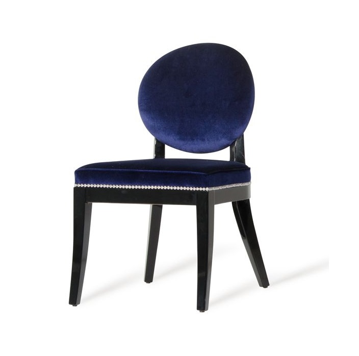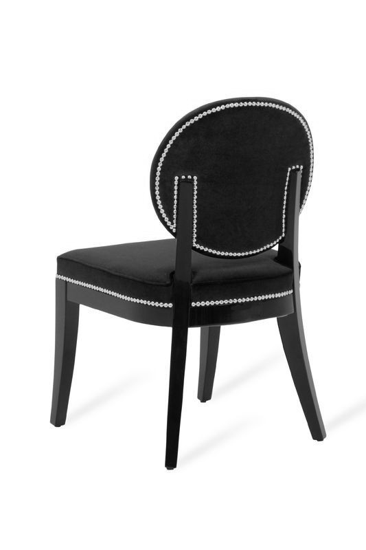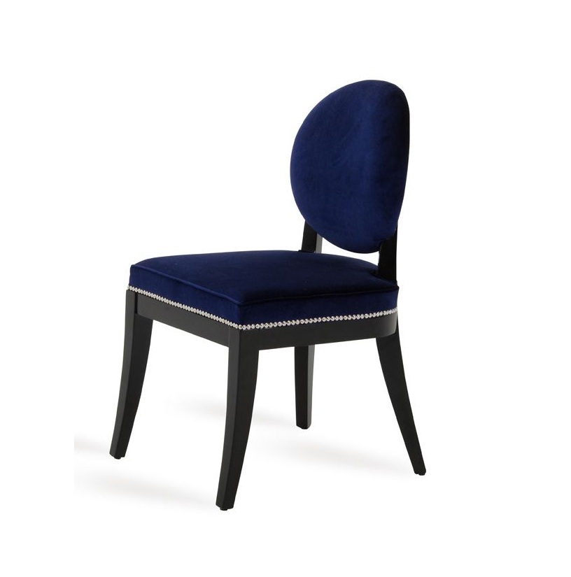 Isabella Modern Blue Dining Chair exudes class and stylishness featuring an oval back and curved seat upholstered in bold black fabric. Framed in black high gloss wood frame, it features polished chrome nail-head trims around the back and seat.