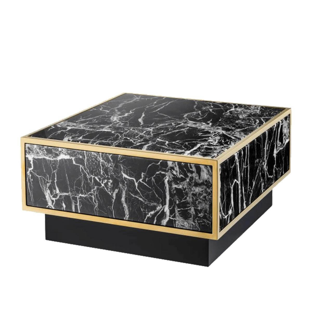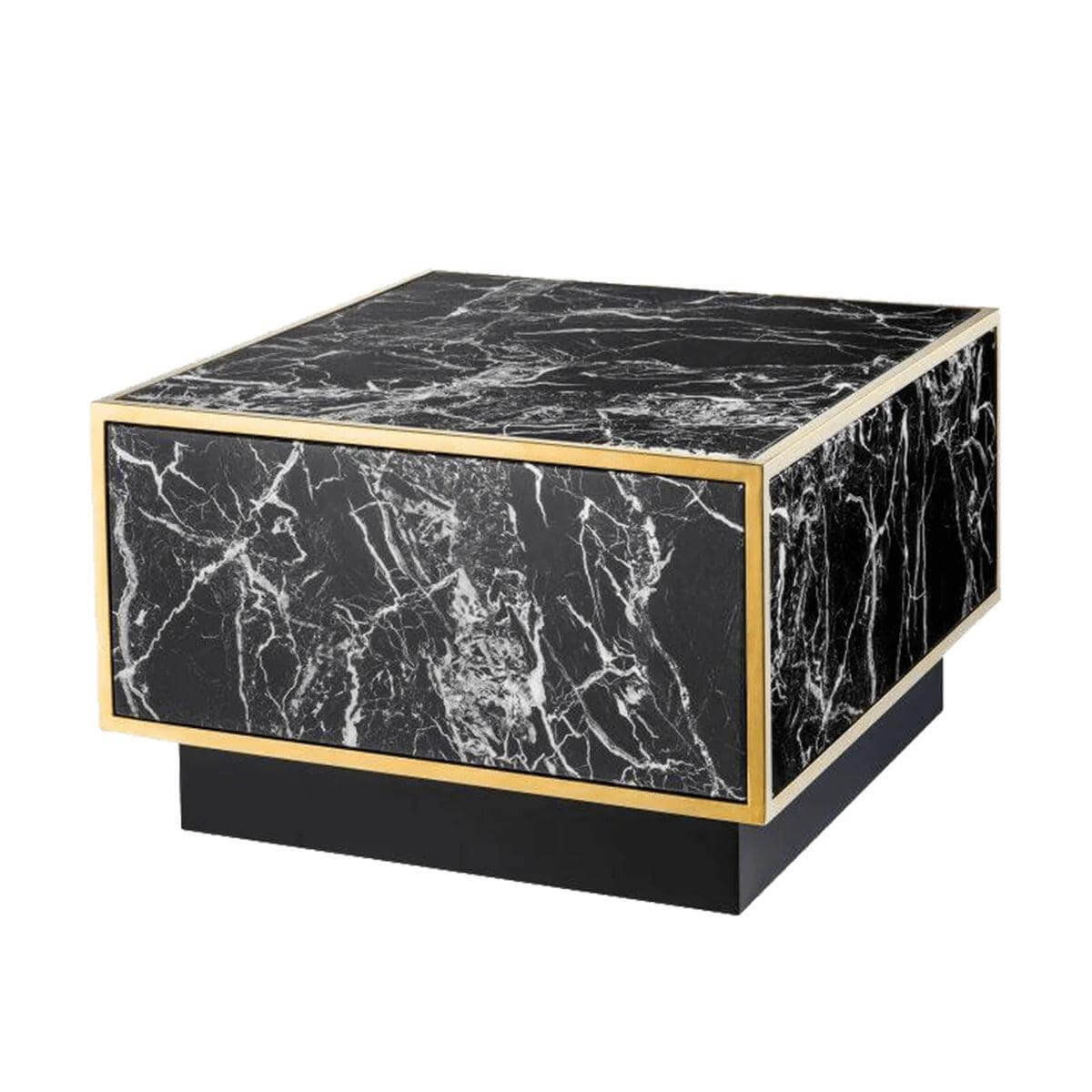 A square table featuring marble tabletop and sides set in a brass frame and a black base. These tables can be purchased as a standalone piece or as a set to add a statement layered effect to any room.