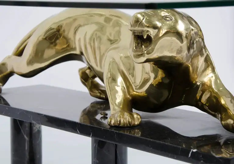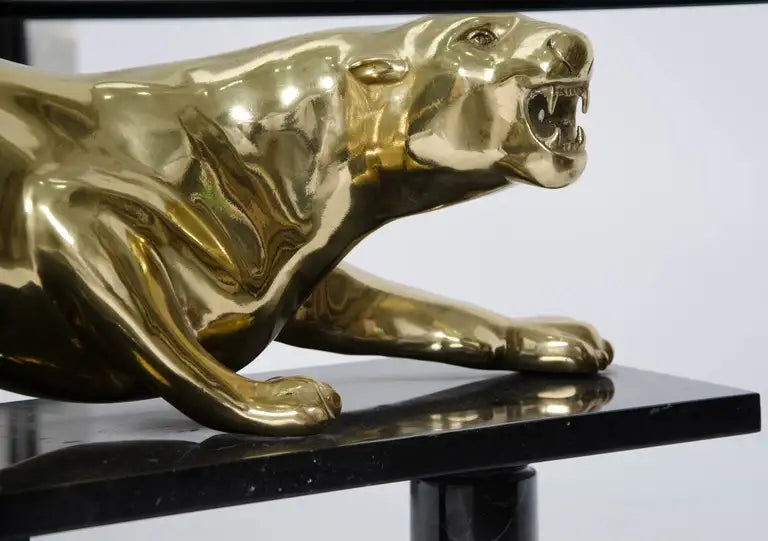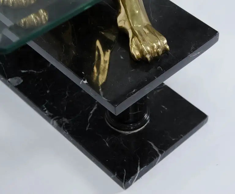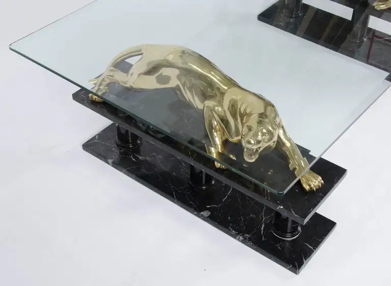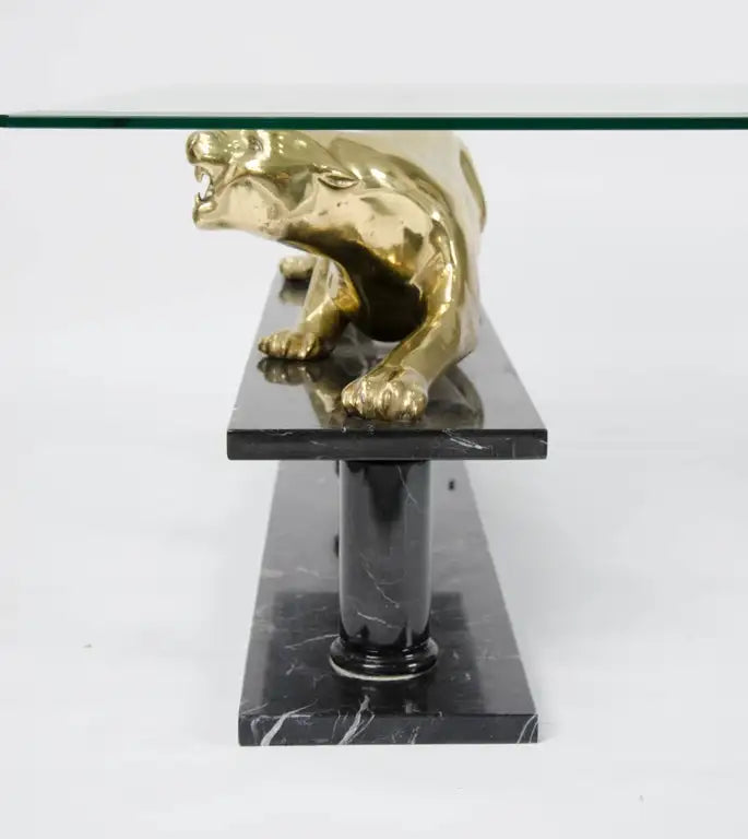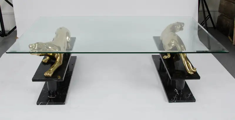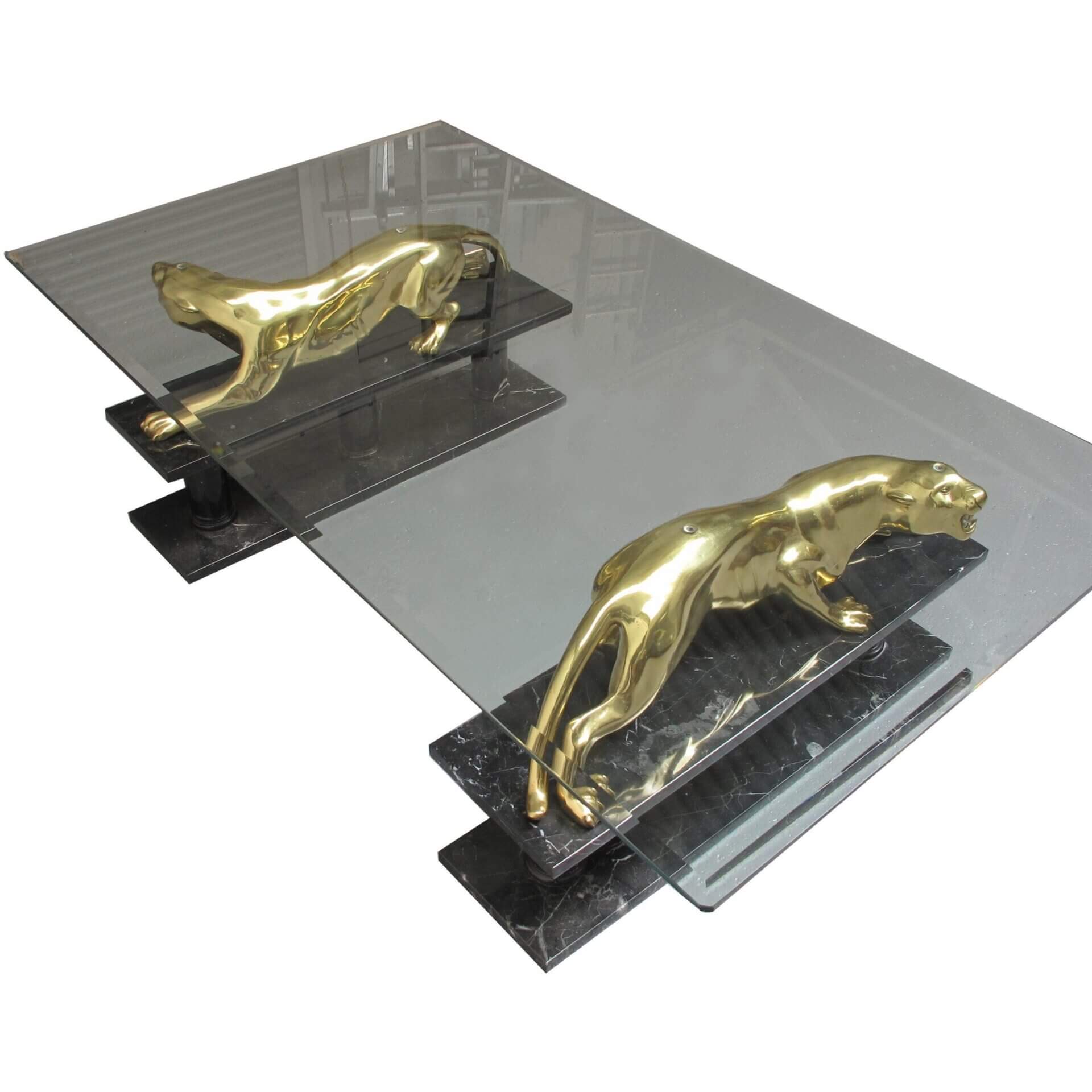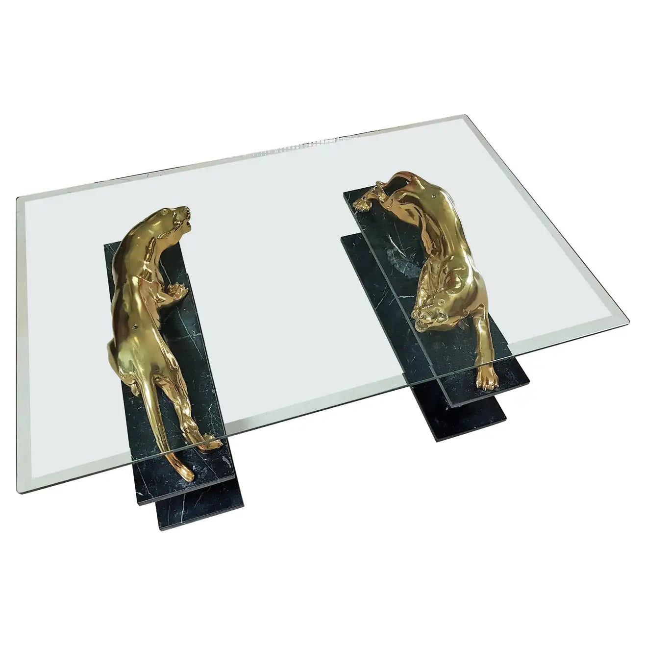 A very unusual and rare coffee table. Black marble base with light veins, brass panther sculptures. panthers can be removed from base. Can be used as sculptures or table.