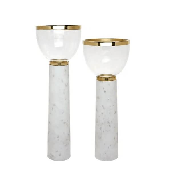 Heighten your candle display with the earthen luxe beauty of the Julius Candle holder. Body is made of white marble for natural strength and sturdiness with earthen luxe appeal. Clear glass bowl allows light from a flickering pillar candle within (not included) to filter out beautifully to bring cosy illumination to your space. Accented with gold details around the bowl’s rim and base for an added touch of luxury. Stands at over 60cm tall and can be displayed freestanding on the floor for an impactful addition to your décor.