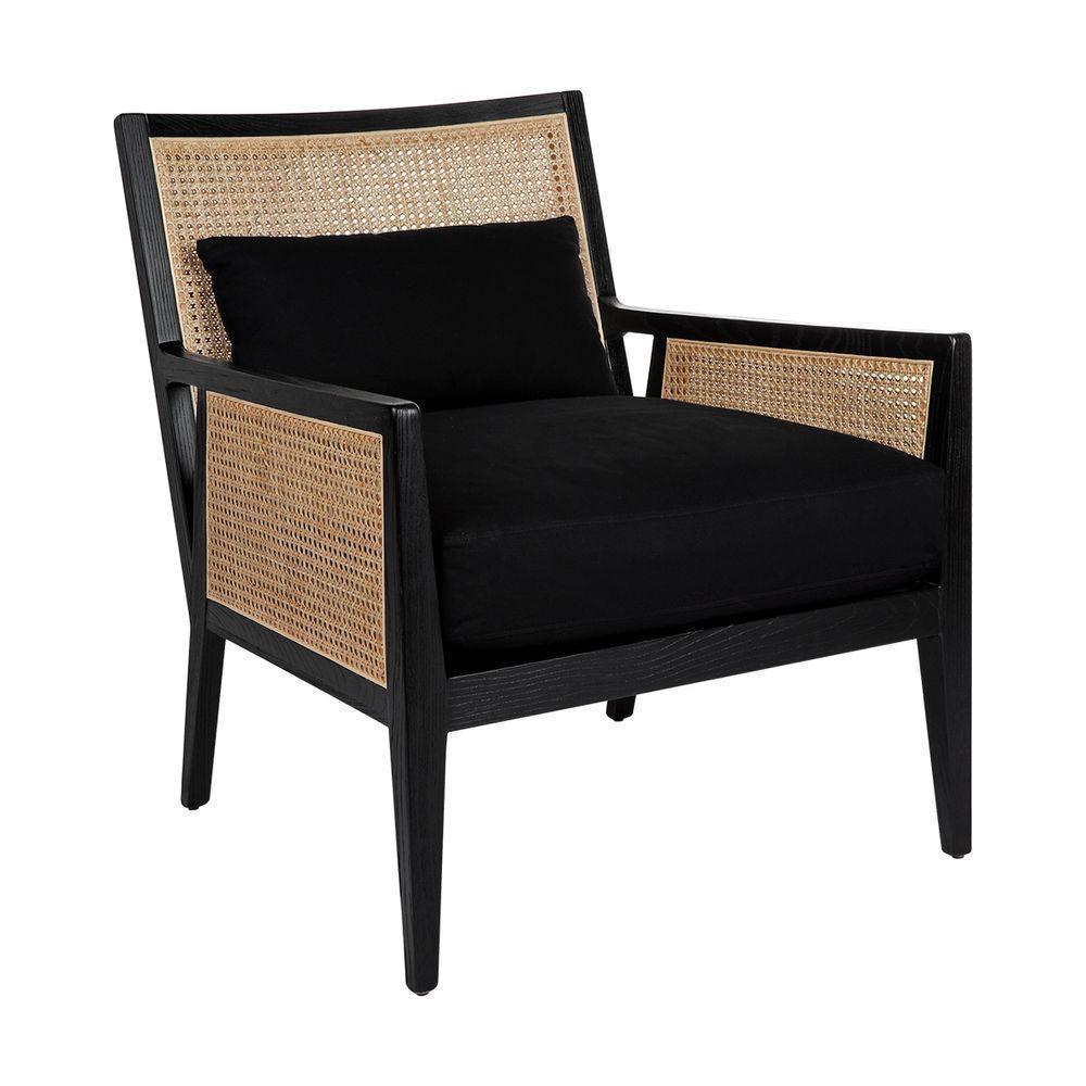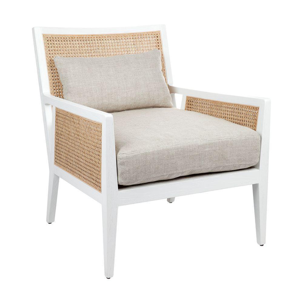 The Kane arm chair is in style. Featuring a natural rattan back with an upholstered seat cushion in a white linen/cotton blend sturdy fabric. Soft seating with feather and foam fill beautifully finished in a black birchwood frame with straight/tapered classic legs