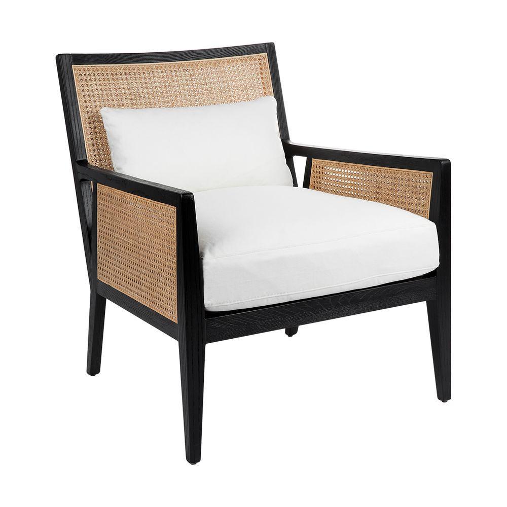The Kane arm chair is in style. Featuring a natural rattan back with an upholstered seat cushion in a white linen/cotton blend sturdy fabric. Soft seating with feather and foam fill beautifully finished in a black birchwood frame with straight/tapered classic legs