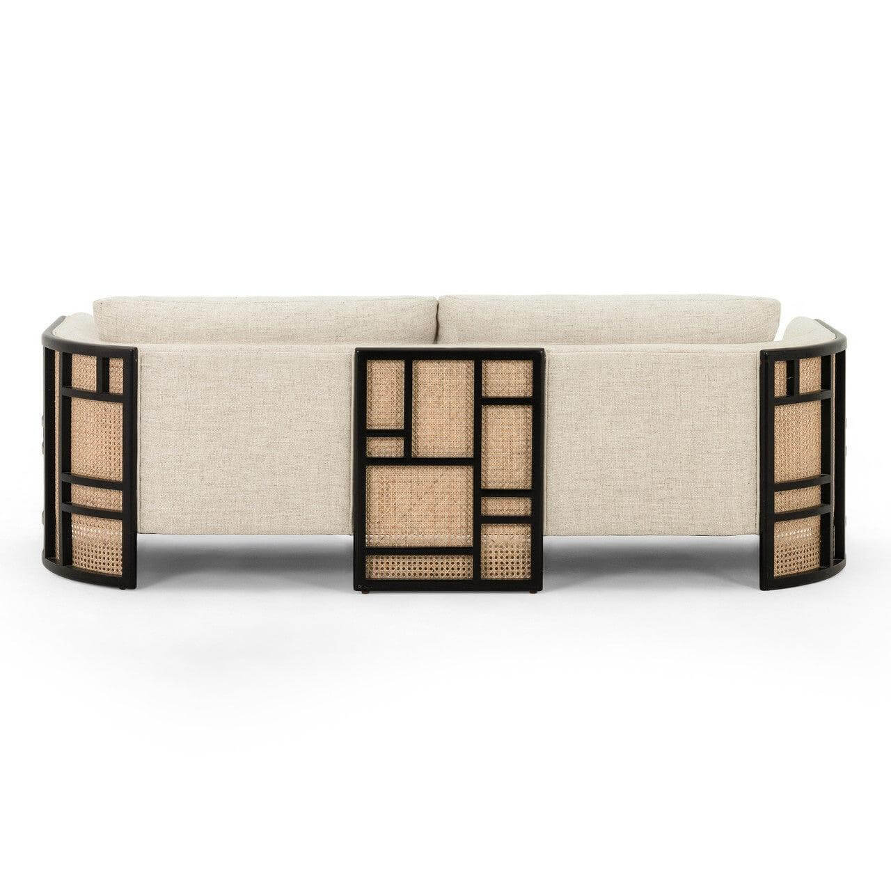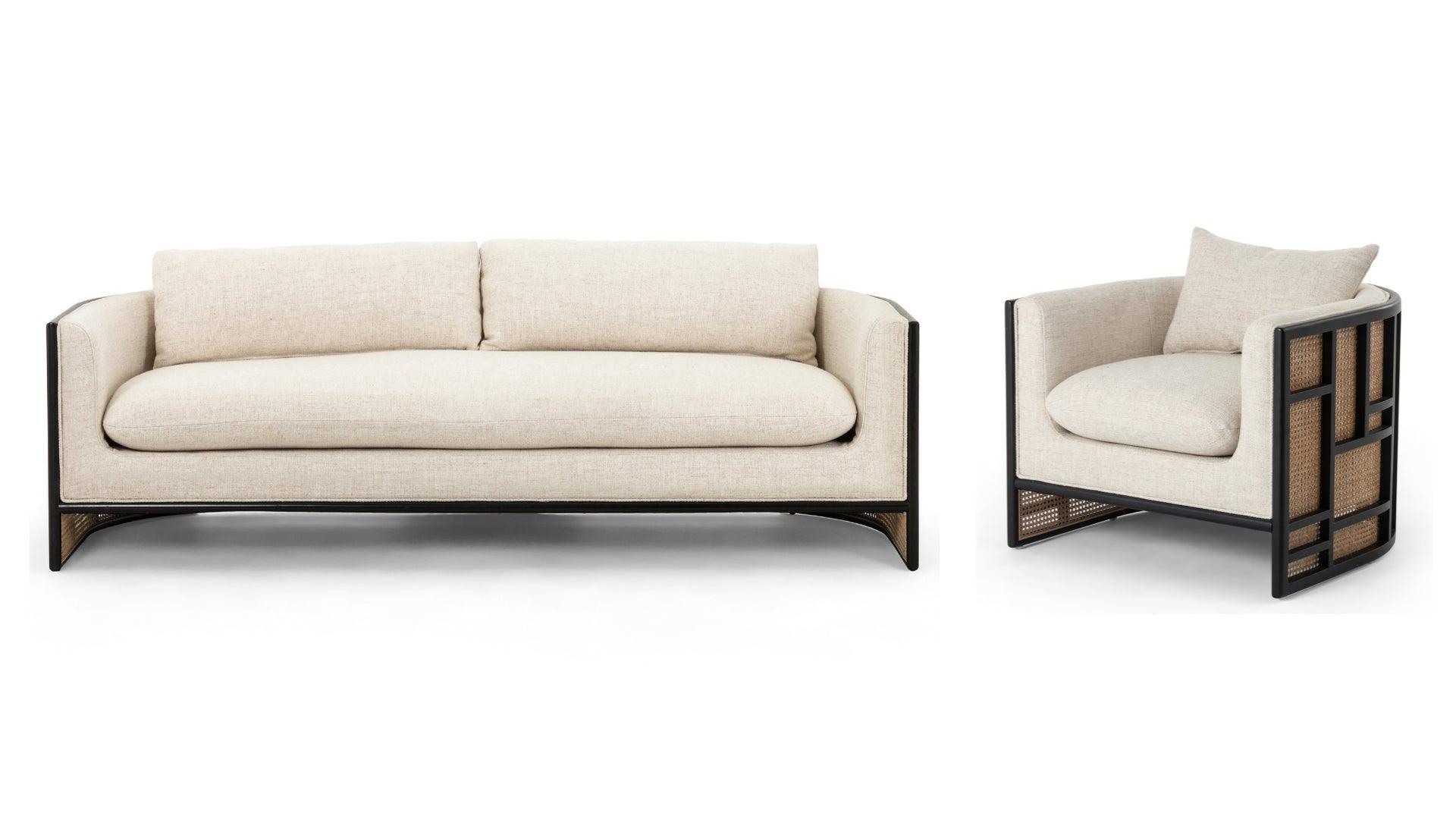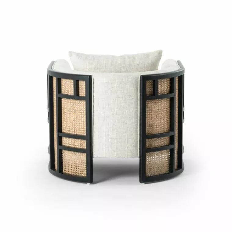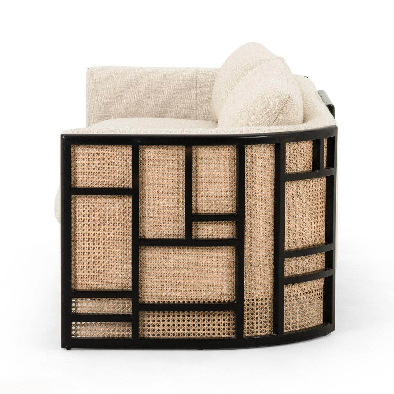 Textural and curve driven. Inspired by Japanese Tatamis, a cleverly constructed outer frame consists of natural cane and black birch paneling. Adding to that clean color contrast sits cream linen-blend performance seating exclusive to Avant Garde Furniture, with dual knife-edge pillows for extra comfort.