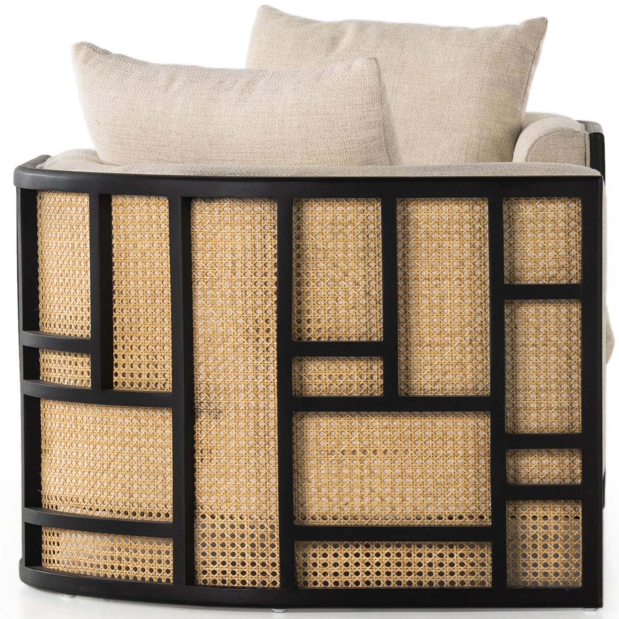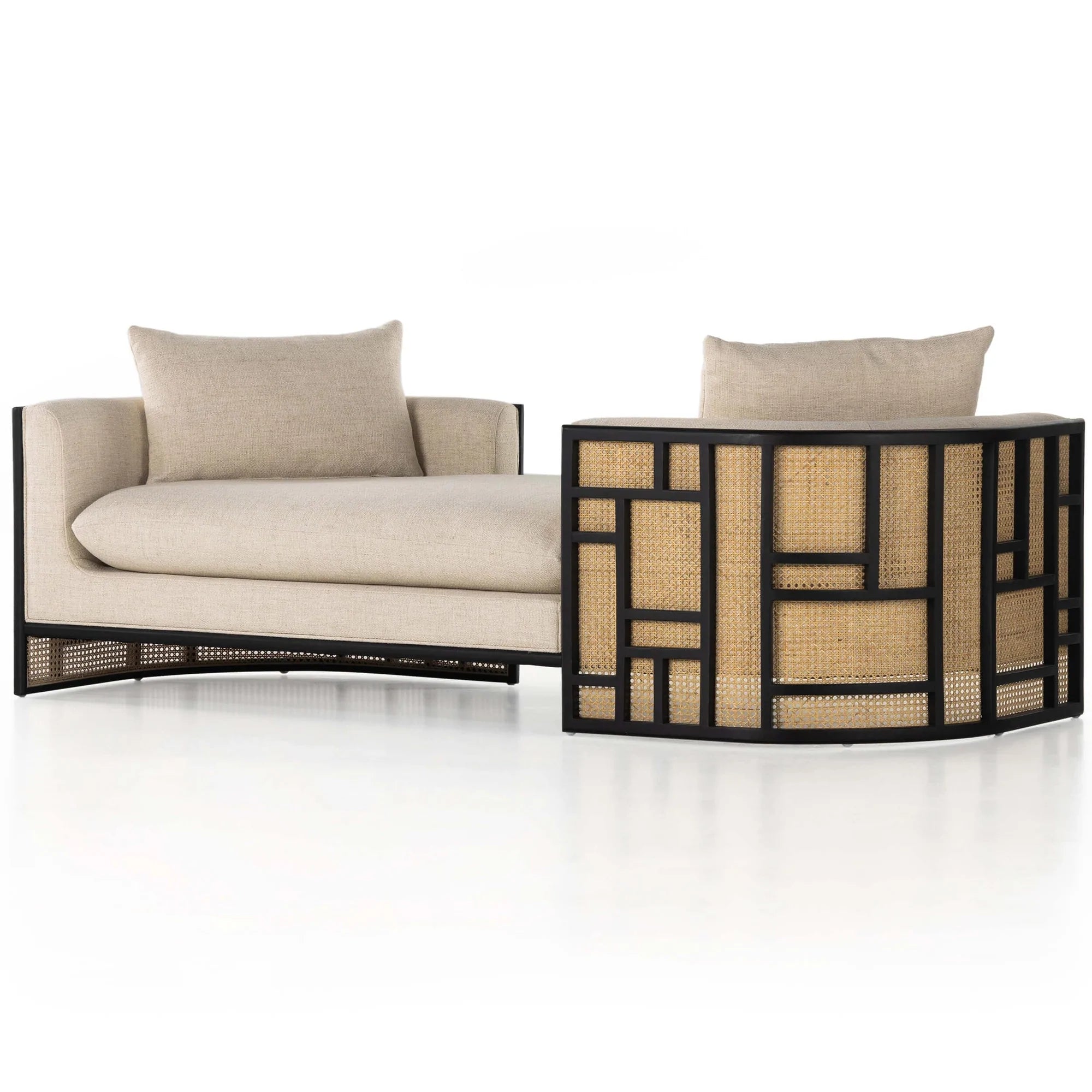 Textural and curve driven. Inspired by Japanese Tatamis, a cleverly constructed outer frame consists of natural cane and black birch paneling. Adding to that clean color contrast sits cream linen-blend performance seating exclusive to Avant Garde Furniture, with dual knife-edge pillows for extra comfort.