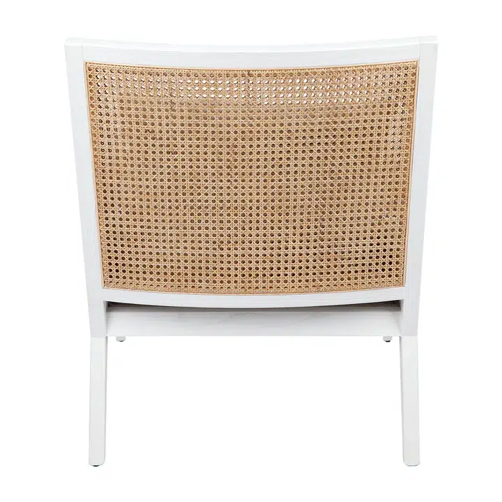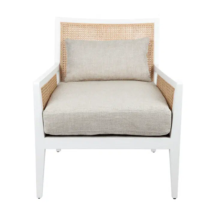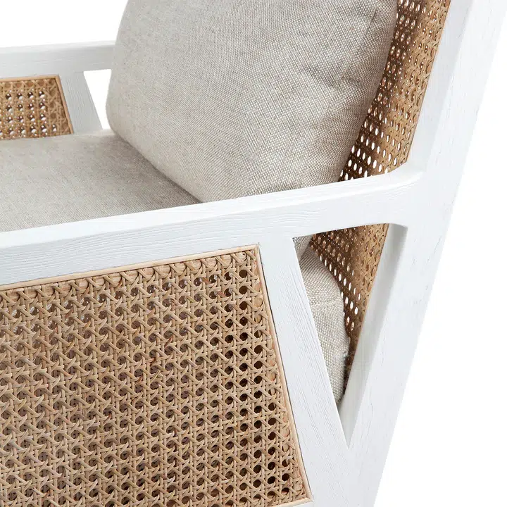 Kane White Rattan Arm Chair – Natural Linen. The Kane arm chair is in style. Featuring a natural rattan back with an upholstered seat cushion in a Natural linen/cotton blend sturdy fabric. Soft seating with feather and foam fill beautifully finished in a White birchwood frame with straight/tapered classic legs