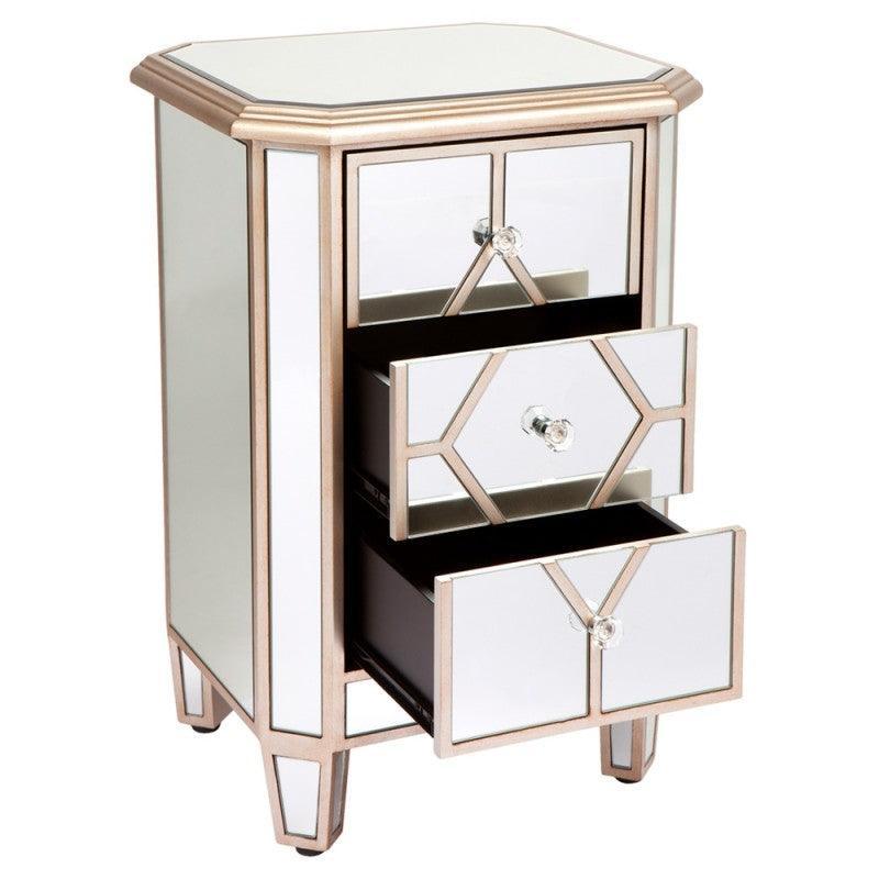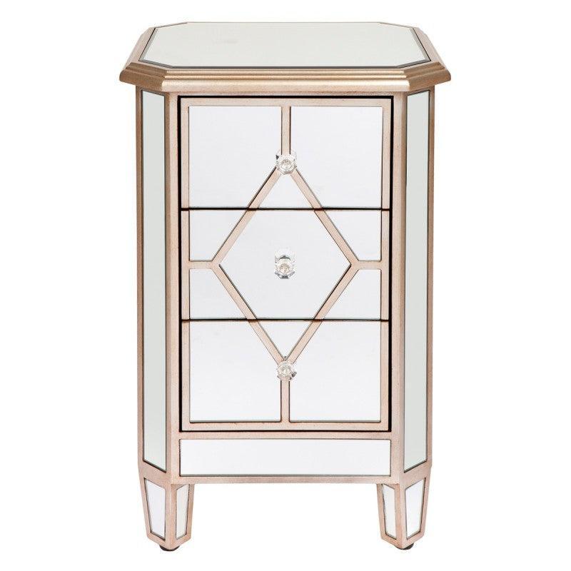 Kensington Champagne Mirror Bedside Table. Champagne finished wood frame with top clear bevelled mirror glass inlay. 3 Drawers fitted with metal runners and clear glass knobs.