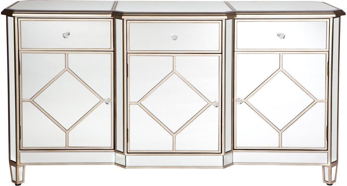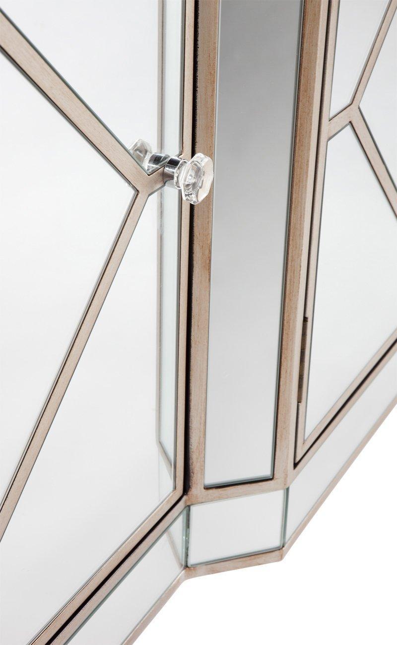 Antique Champagne finished wood frame with top beveled clear mirror glass inlay and sides. 3 Drawers fitted with metal runners and clear glass knobs. 3 Doors with adjustable fitted shelves, door magnets and clear glass knobs. Colour variances throughout the range.