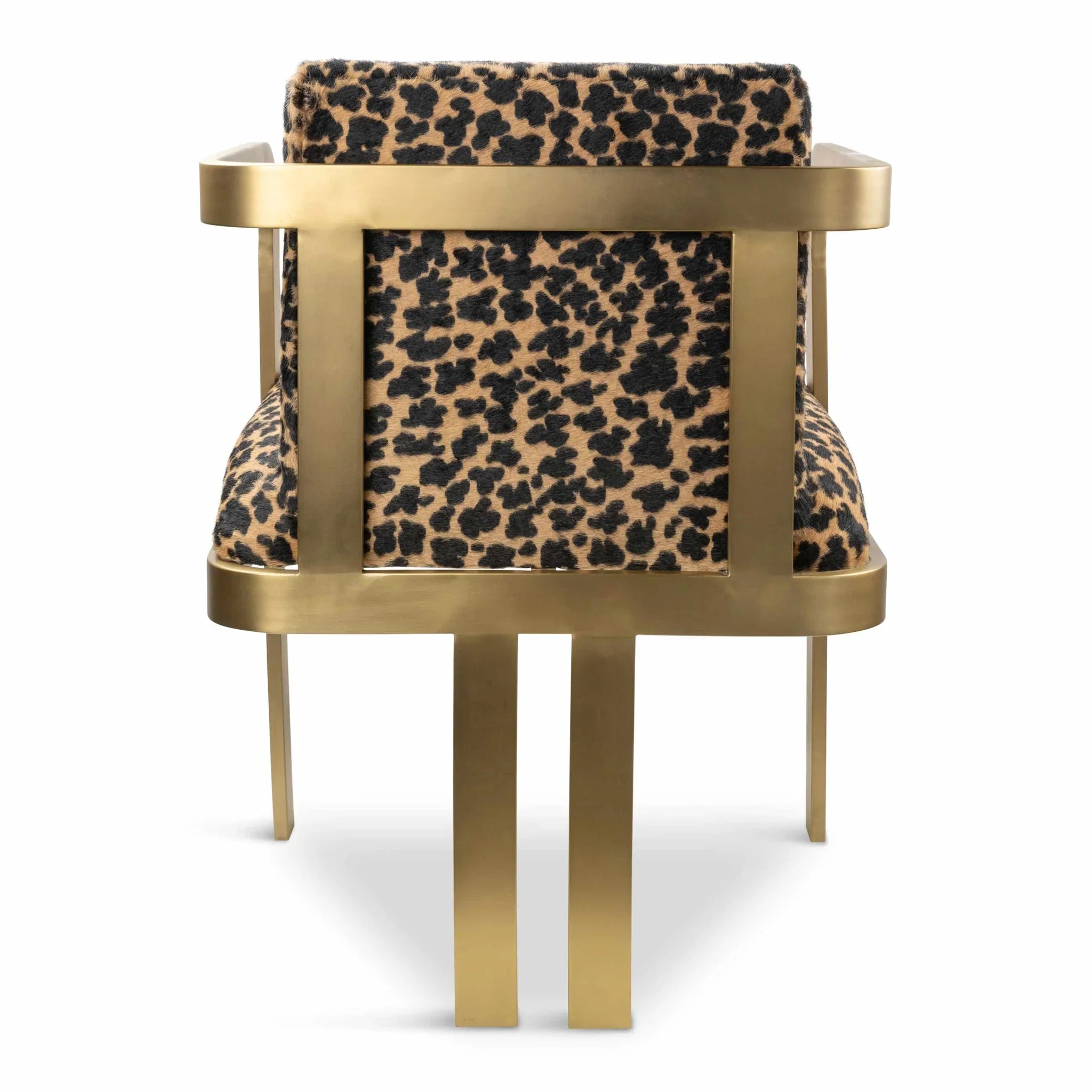 Introducing our all new Kingpin Dining Chair in cowhide. With a unique brushed brass frame and an upholstered seat and backrest, you’ll surely feel like a kingpin sitting in this one-of-a-kind chair. Shown in Cowhide with Leopard Print on Caramel. Custom metal and fabric options available.