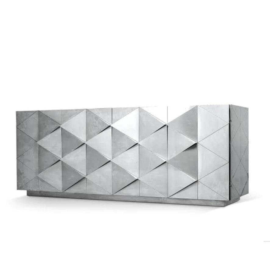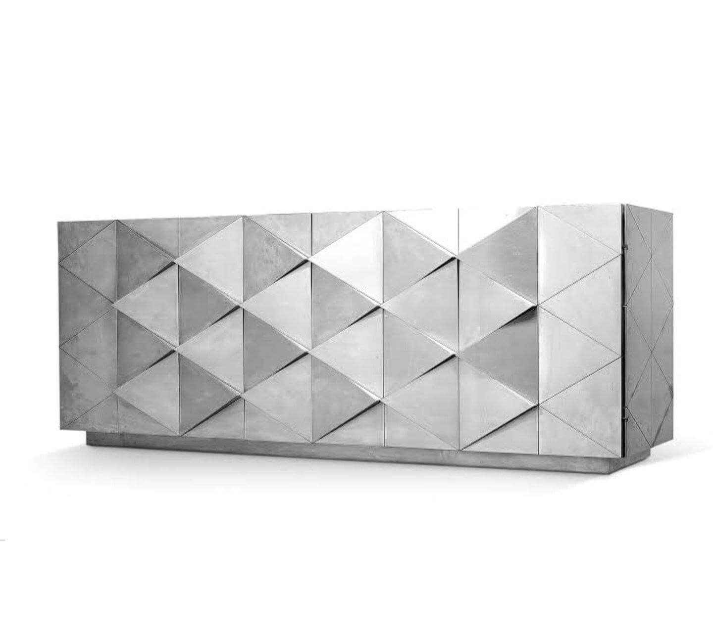 Rare piece of furniture with rectangular frame, rectangular top and two hinged doors in brushed nickel finish stainless steel animated by embossed triangles, fitted with mobile shelves and interior in black hardwood, resting on a base with recessed plinth base.