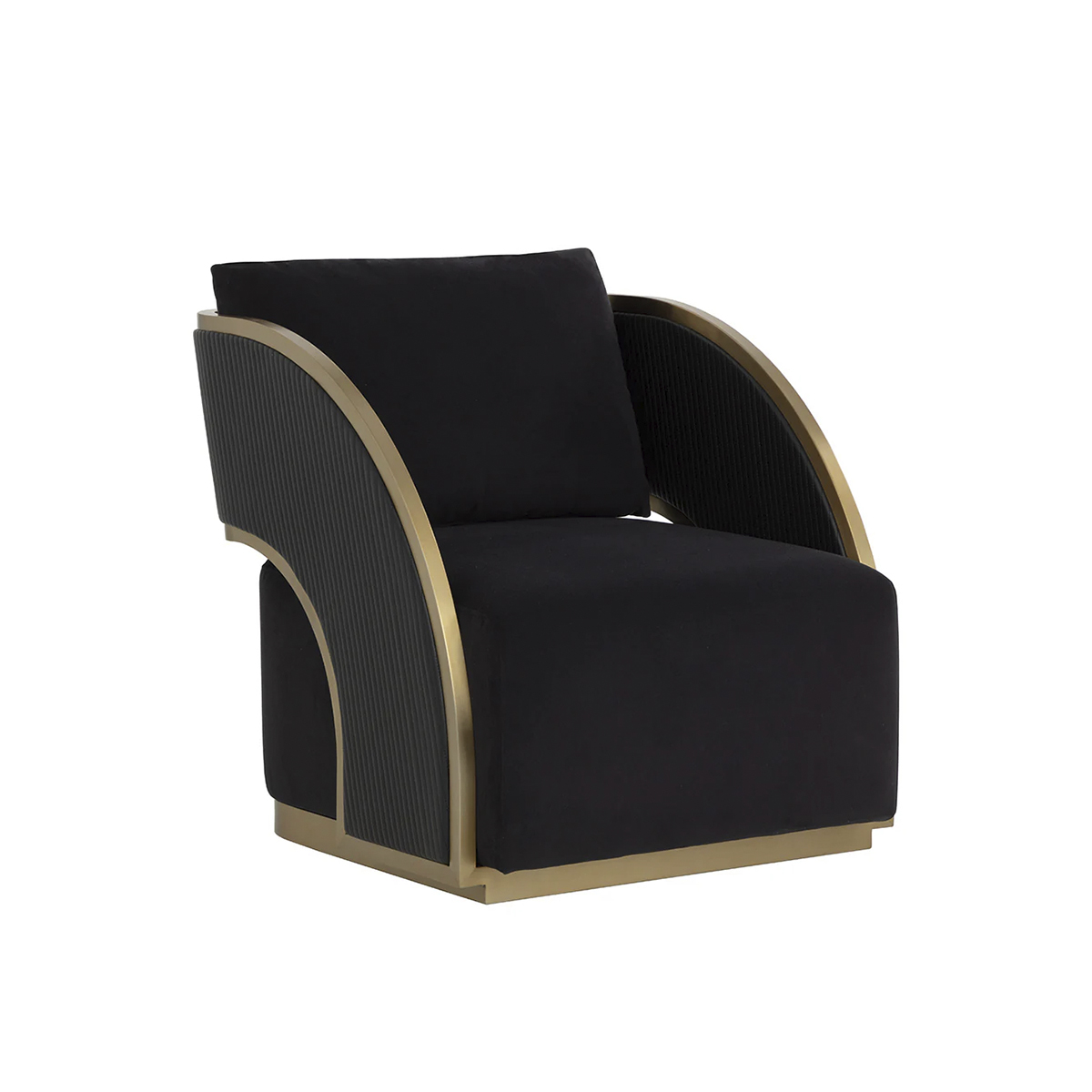 Bold and stylish, the Lagonda Swivel Lounge Chair is sure to turn heads. Featuring a daring silhouette upholstered in Avant Garde velvet black fabric accentuated by Black leather. Brushed Gold 304 stainless steel detailing and channel stitching add depth and visual impact to the overall look of the piece. Frame crafted from solid wood that is kiln-dried and reinforced for added durability and strength. No sag sinuous spring support helps maintain its shape over time. Corner block construction brings lasting stability. Seat cushion made with foam for ample comfort and support. Brushed 304 stainless steel base and arms provide durability and strength.