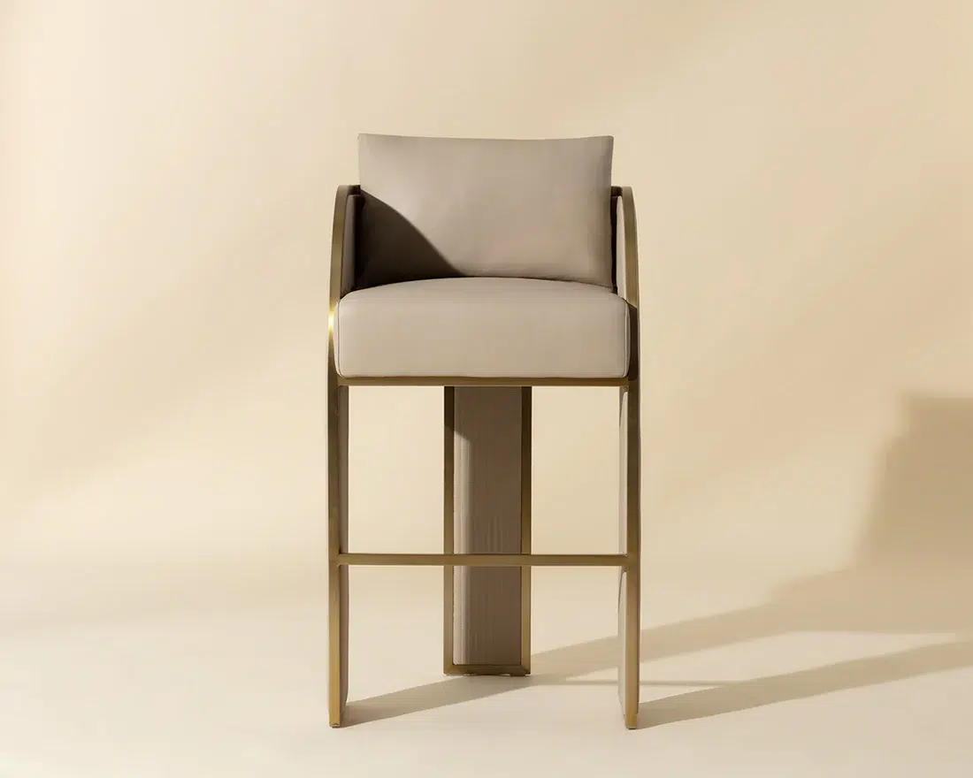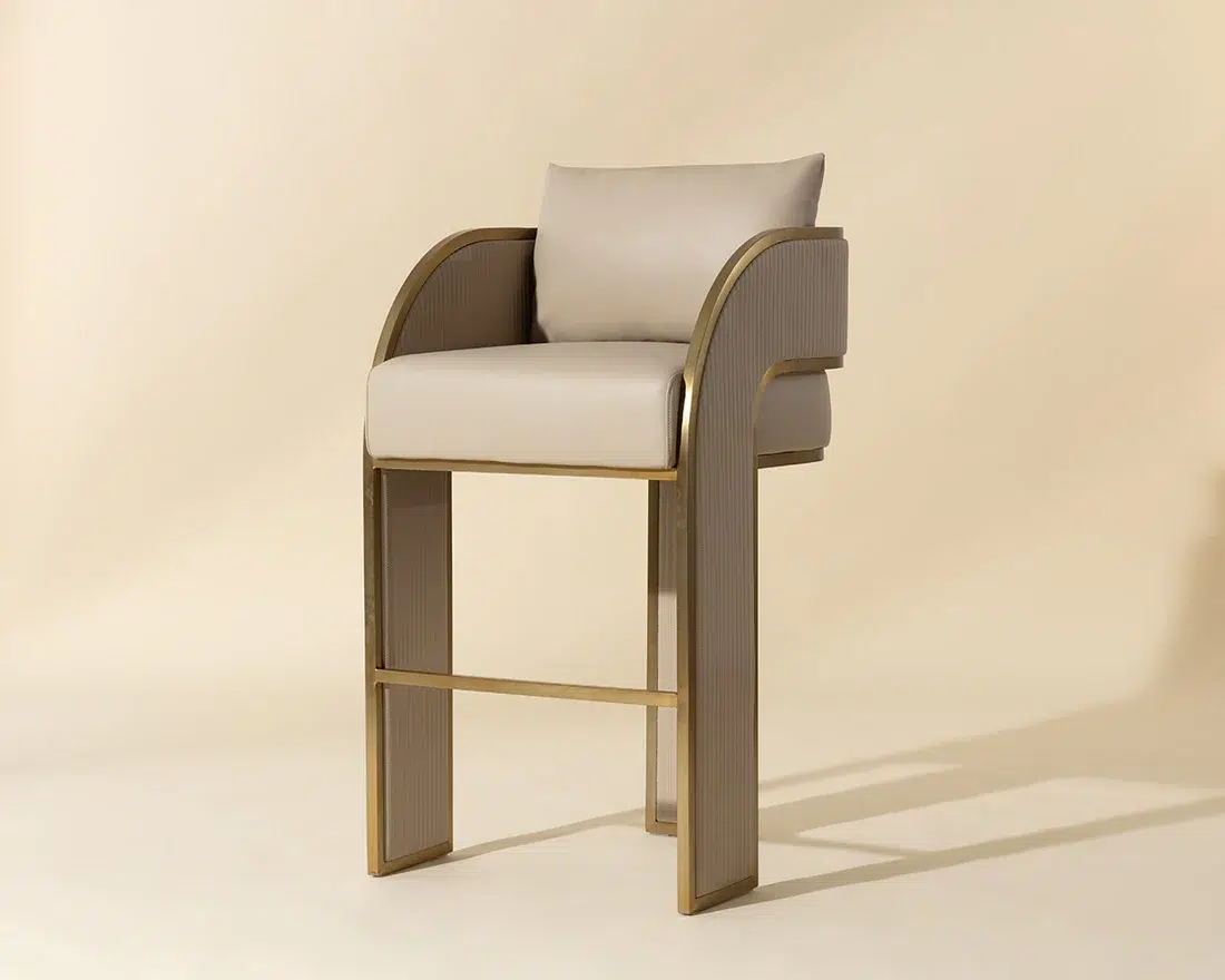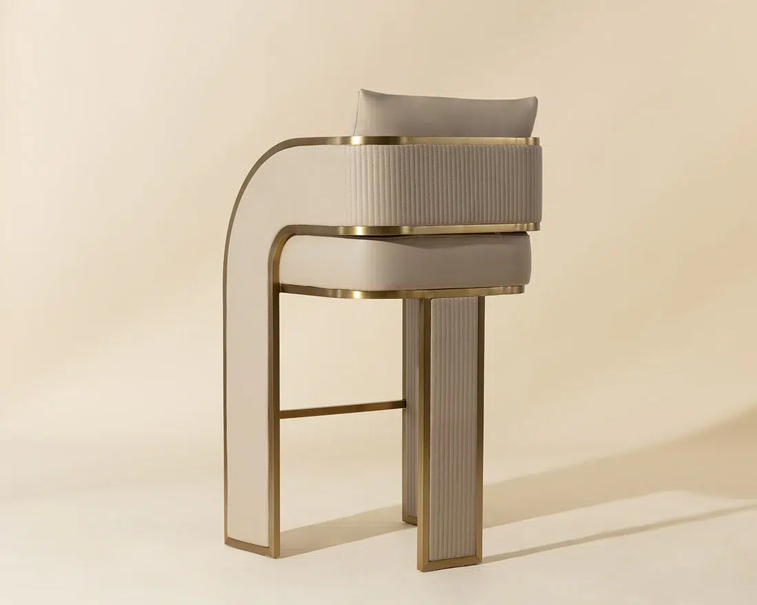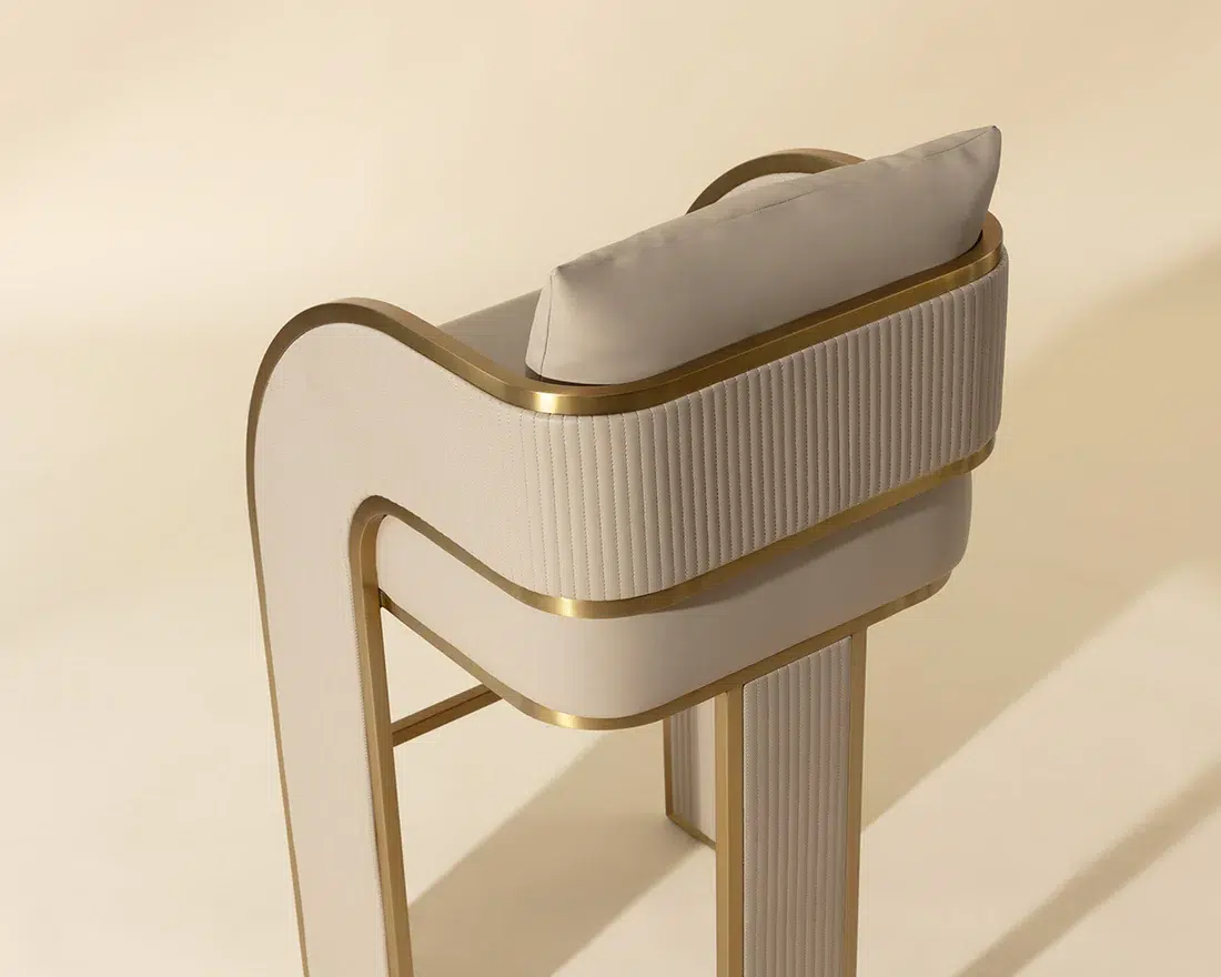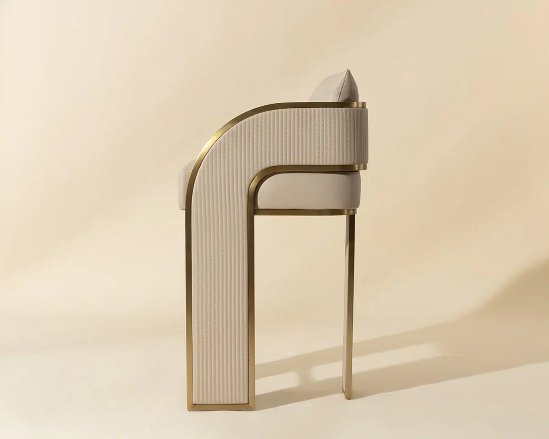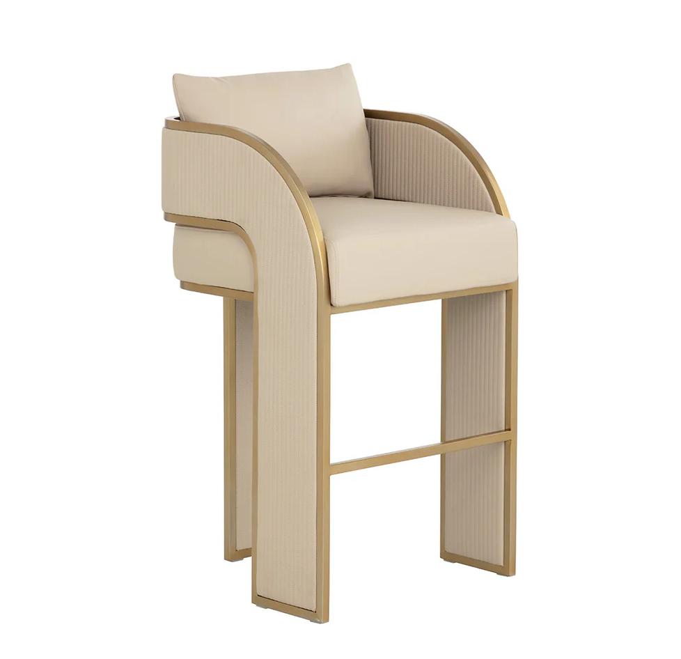 Bold and stylish, the Lagonda Barstool is sure to turn heads. Featuring a daring silhouette upholstered in Cream leather. Brushed Gold 304 stainless steel detailing and leather channel stitching add depth and visual impact to the overall look of the piece.