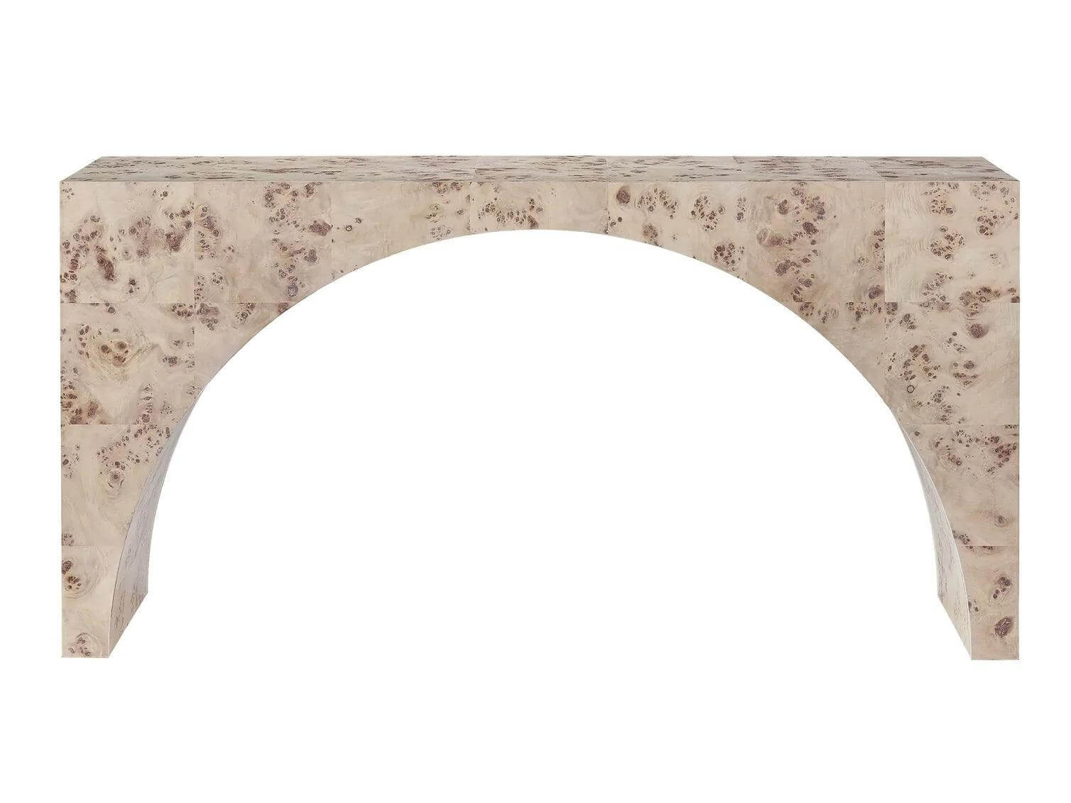 The Langley Cocktail Table features a gorgeous burled tabletop supported by four half-moon-shaped acrylic legs, making for an ideal living room statement piece.