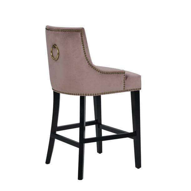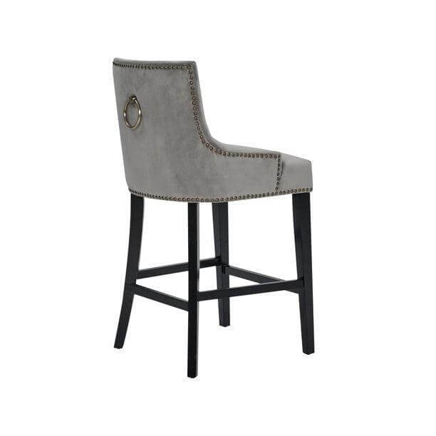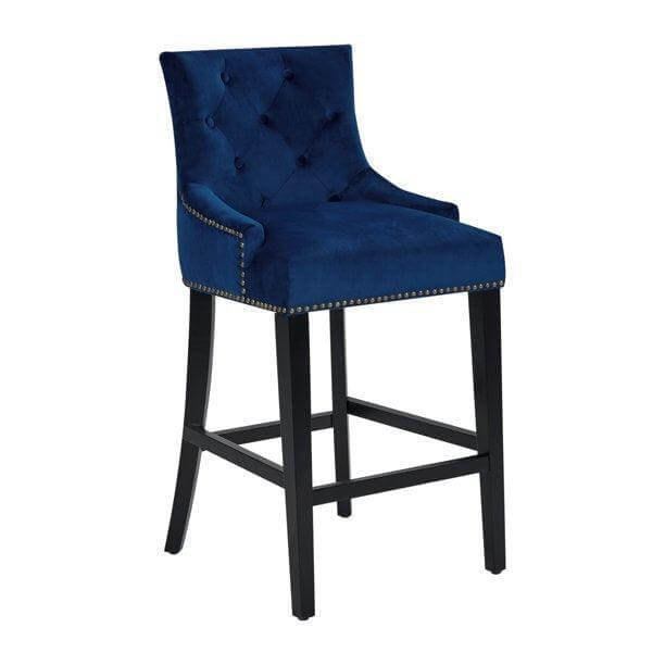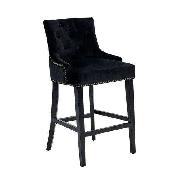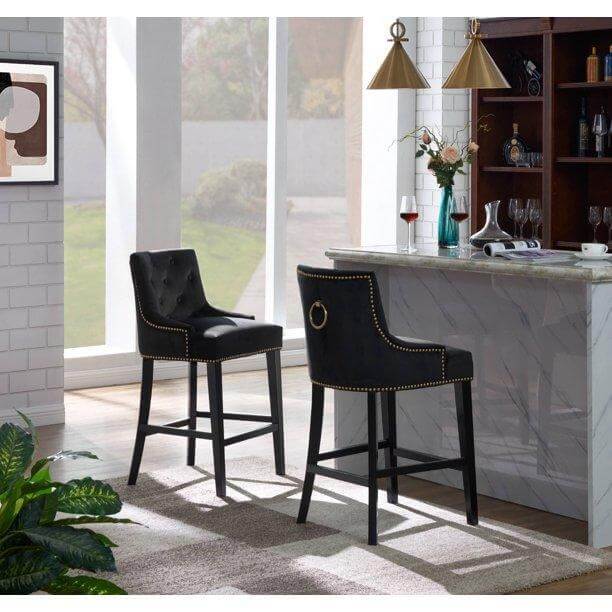 The Largo counter stool is the ideal blend of modern transitional design and comfortable function. Clean, soft lines are created by the black finished tapered wood legs while a button tufted velvet upholstered swoop arm seat with nailhead trim and footrest bar provide for superior comfort. The Largo counter stool works great in multiples and sits beautifully in bar, kitchen, dining and lounge areas.