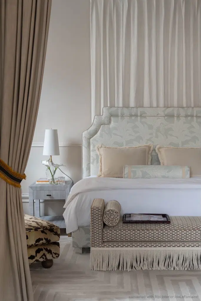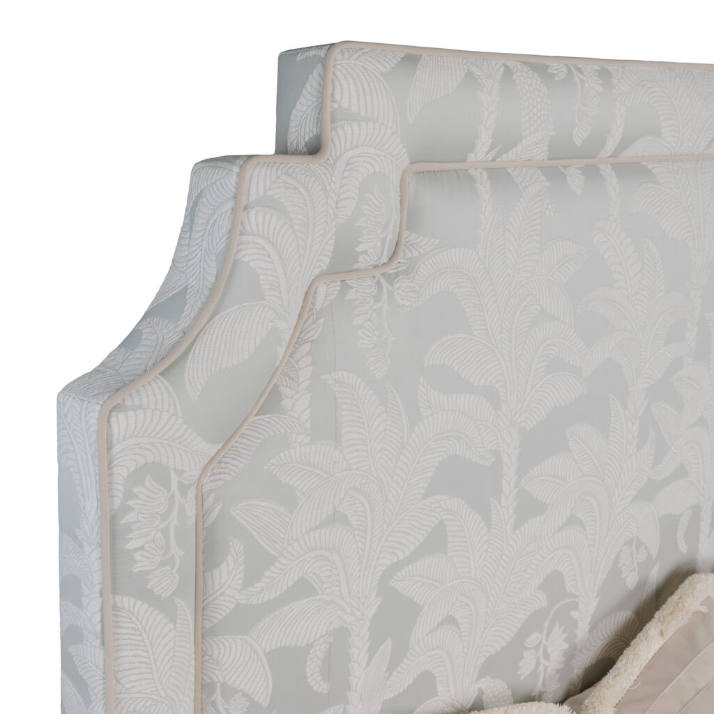 We searched and dreamed endlessly to come up with the perfect shape of a headboard. We landed in Laurent. It brings you that hotel vibe upholstered this beauty in Cancun by Manuel Canovas fabric and cream velvet piping for that soft palette that makes a bedroom dreamy, serene and calm. We added the little extra – because why stop at beautiful – and introduced a bed frame, not very Scandinavian but neither are we. No one wants to see those bed legs and an (often) boring spring board. Sunken down into our frame in the same fabric as the headboard the room feels less cluttered and more tailored. Of course, and as always tailored to your size and needs.