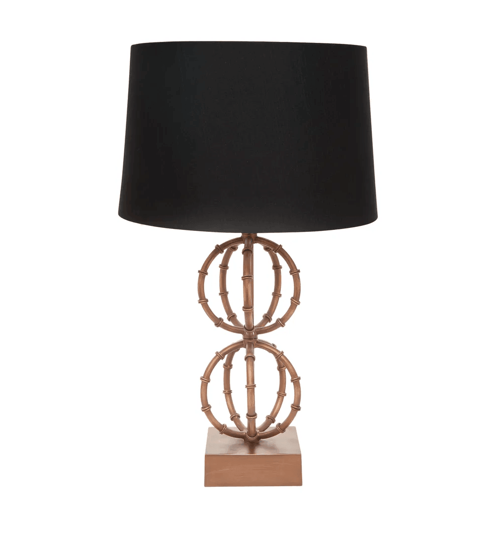 Antique gold bamboo spherical metal frame with black linen tapered drum shade. Colour finish variations may occur with each production