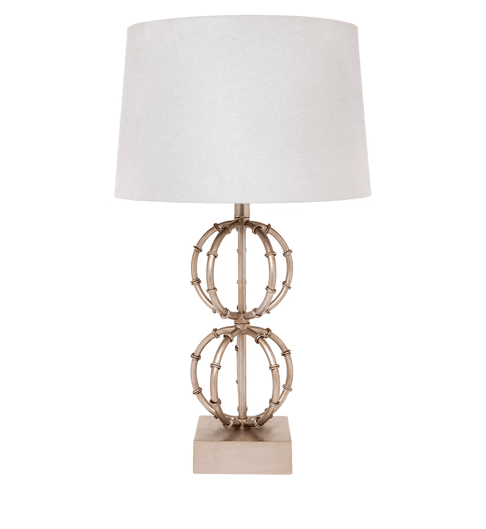 Antique silver finished bamboo spherical metal frame and base complete with a soft grey linen tapered drum shade. Colour finish variations may occur with each production