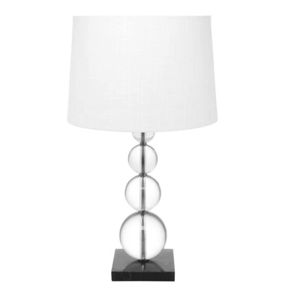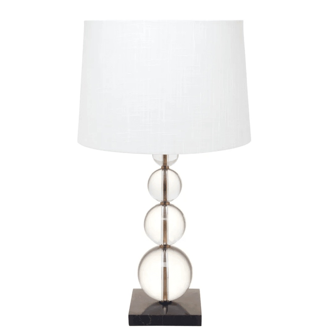 Lindon Table Lamp with Tapered solid crystal ball table lamp detailed with a polished Nickel stem on a square black marble base with a white linen drum shade.