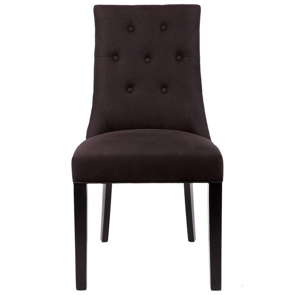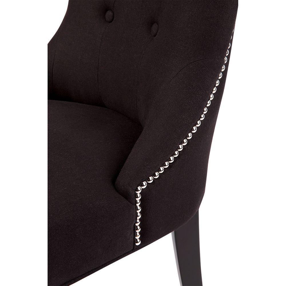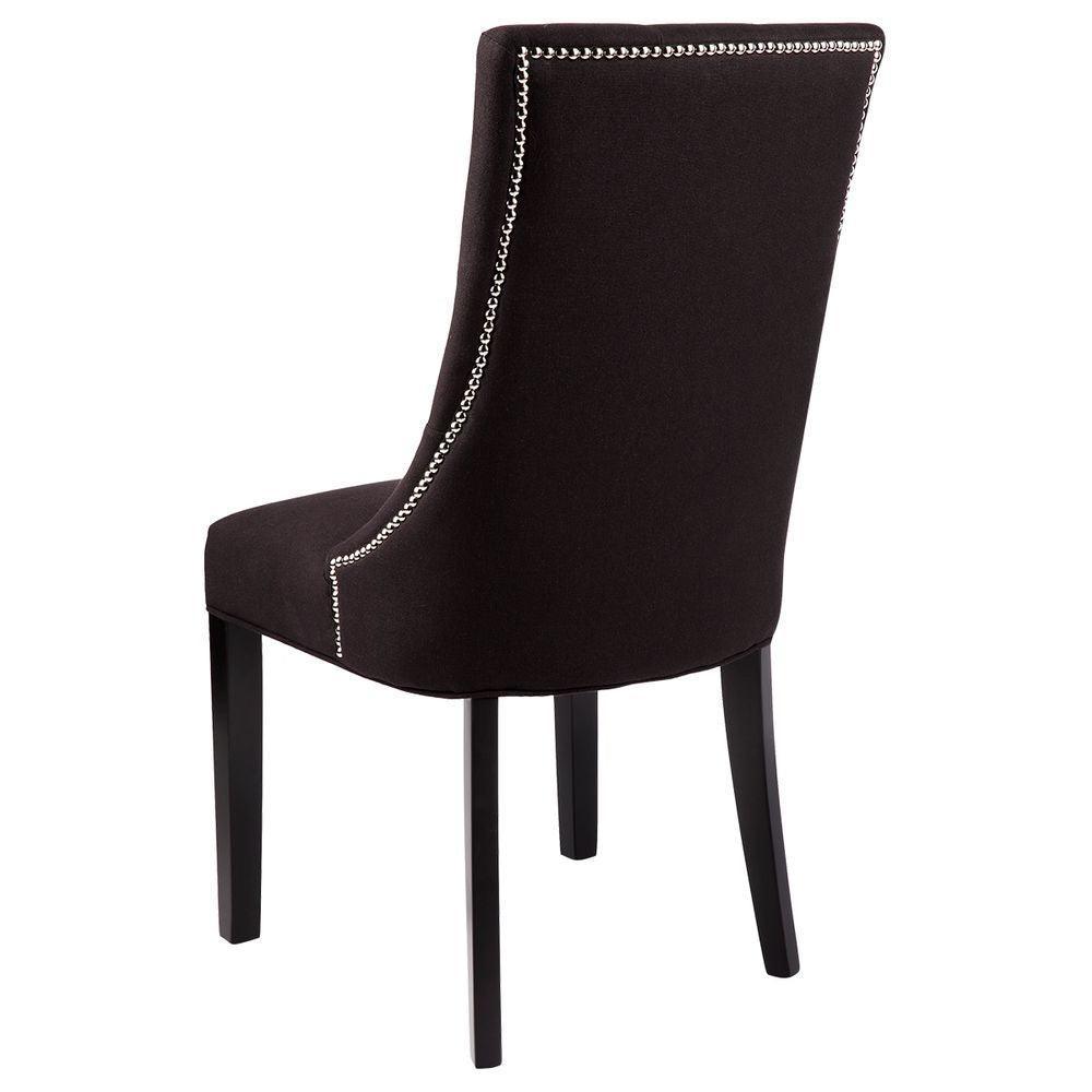 London Dining Chair – Black Linen. Black linen upholstered dining chair. Button tufted back with detailed silver studs and black timber legs. Minimum purchase of 2 chairs required