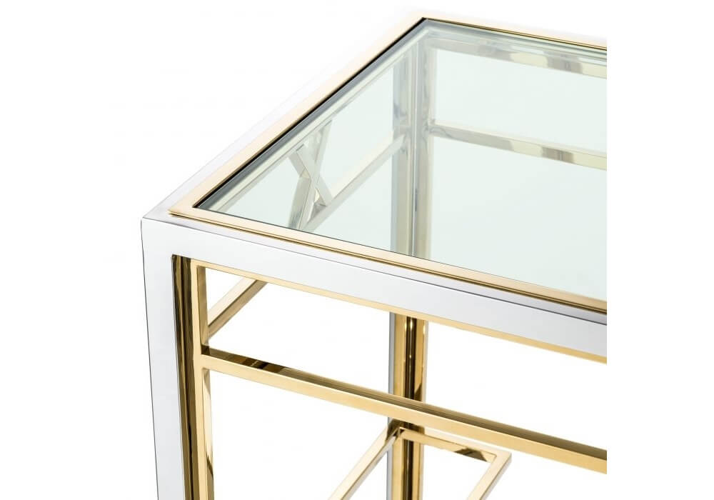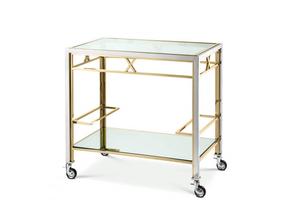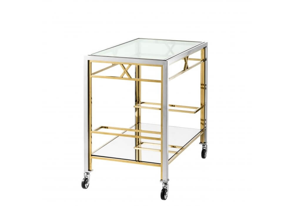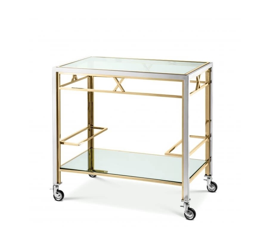 This beautiful bar cart features two levels of clear glass, supported elegantly by a polished chrome stainless steel frame surround. Gold finish accents add an appealing, glimmering aesthetic.