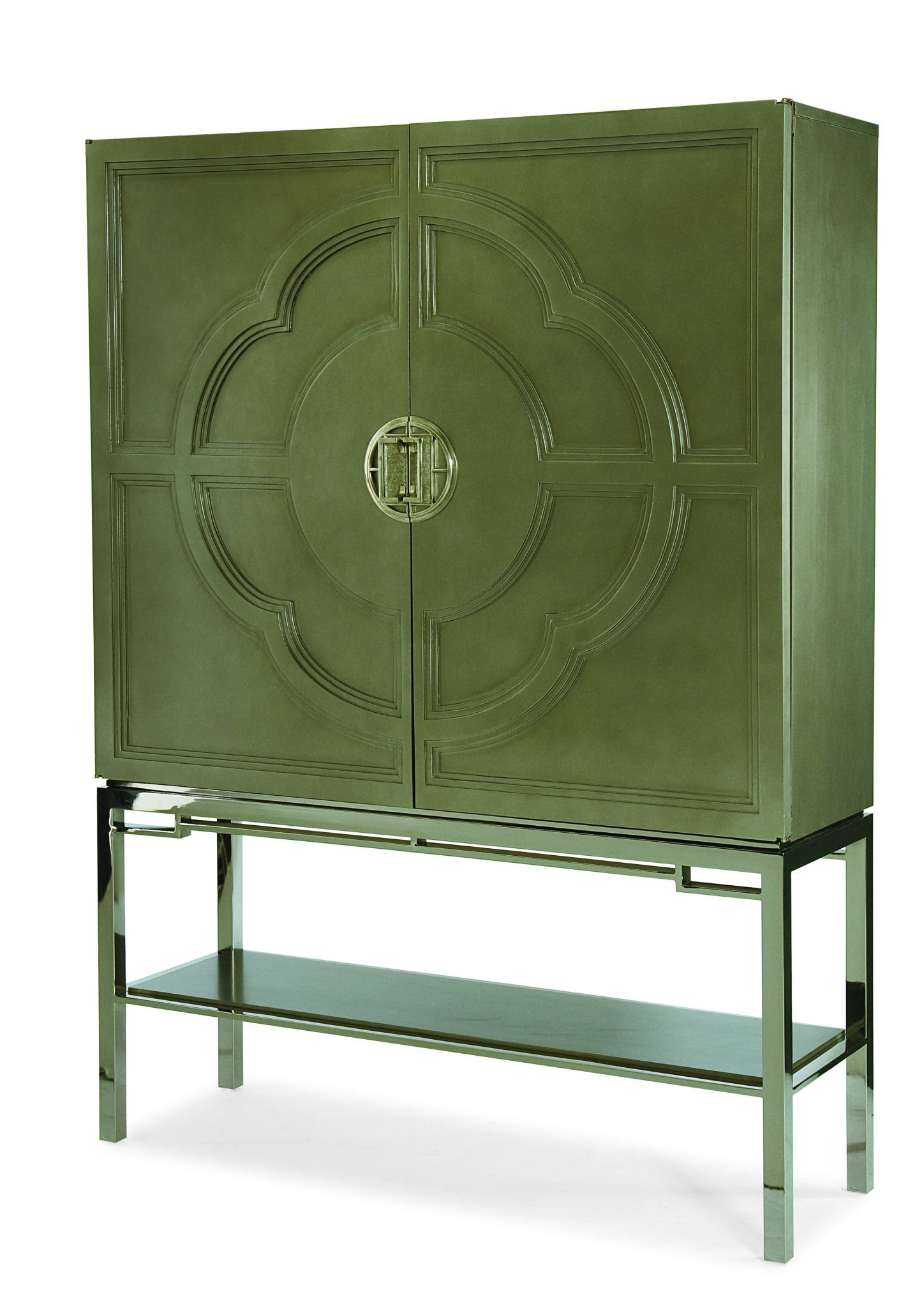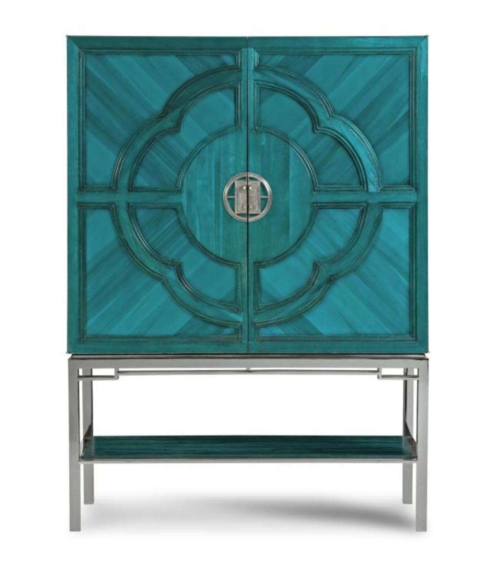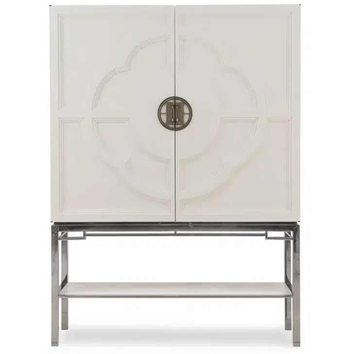 The Lotus bar cabinet features two doors with a quatrefoil motif. Open the doors to show an adjustable wood shelf at the top, a shelf with wine storage, mirrored back, an adjustable glass shelf, and an open shelf that is the top of two drawers. The metal base also has an open shelf in the engaging finish on the body of the cabinet. Lotus cabinet is inspired by Asian design with carved fretwork and vibrant finishes.