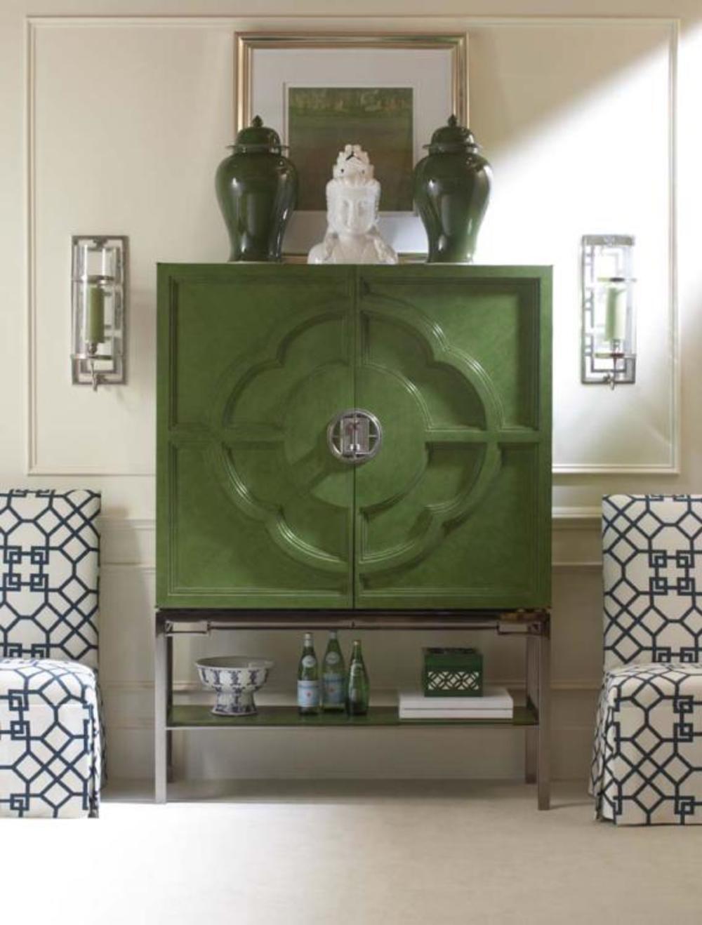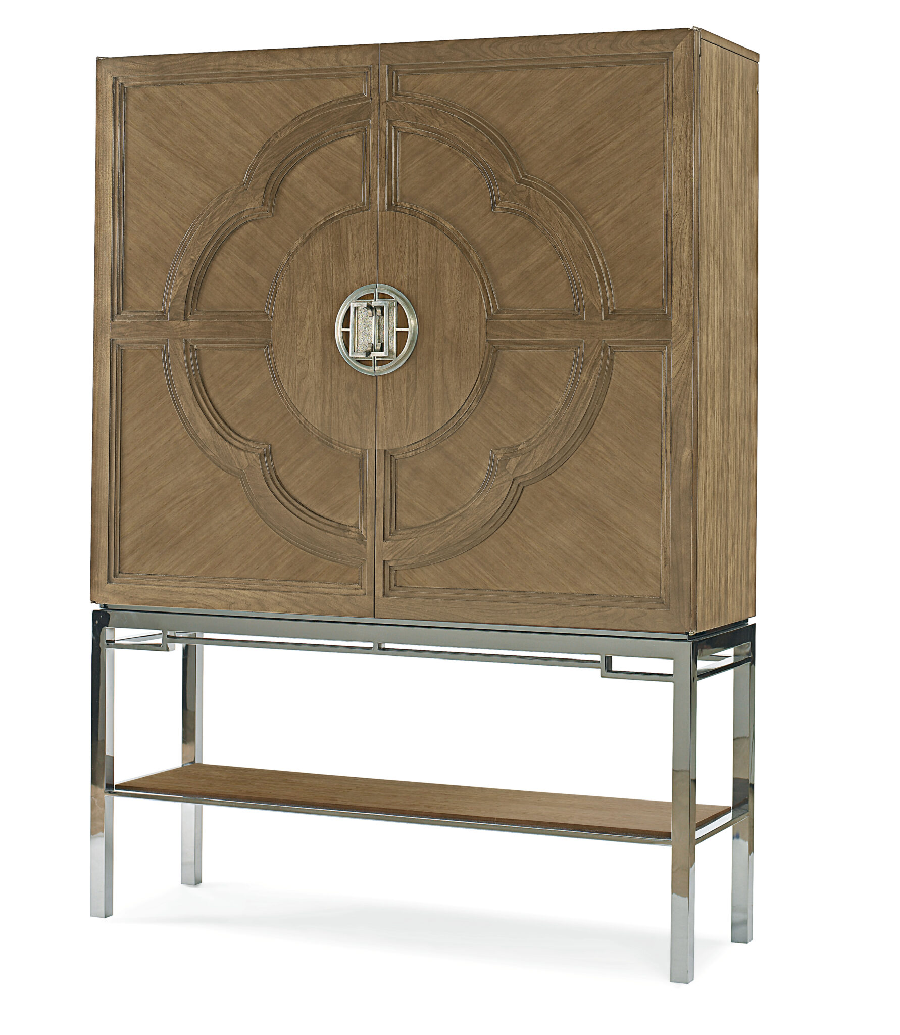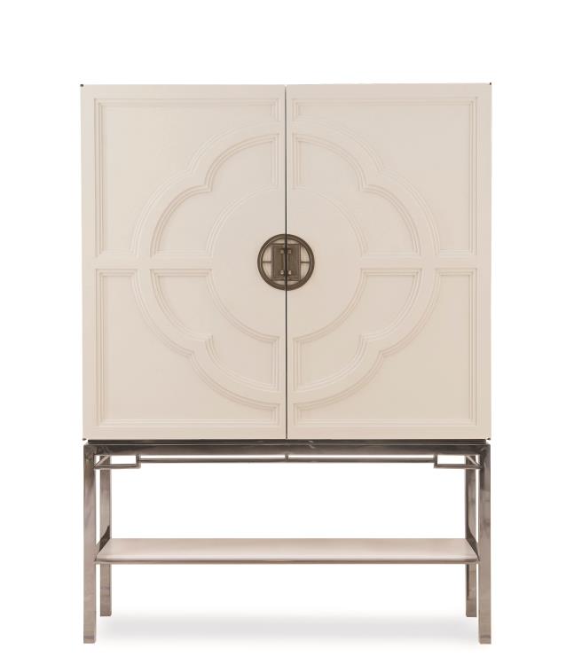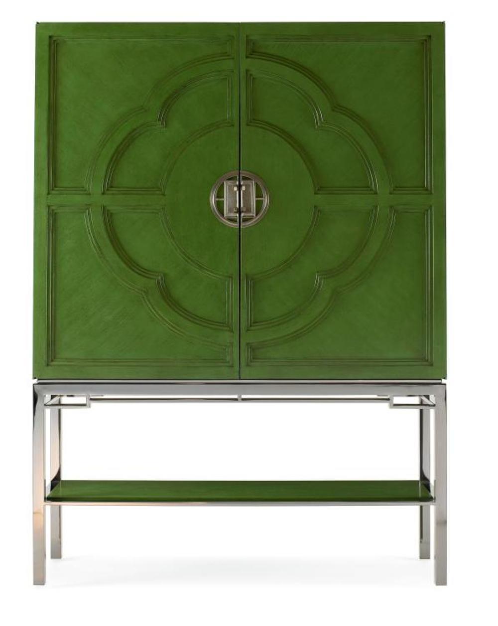 The Lotus bar cabinet features two doors with a quatrefoil motif. Open the doors to show an adjustable wood shelf at the top, a shelf with wine storage, mirrored back, an adjustable glass shelf, and an open shelf that is the top of two drawers. The metal base also has an open shelf in the engaging finish on the body of the cabinet. Lotus cabinet is inspired by Asian design with carved fretwork and vibrant finishes.