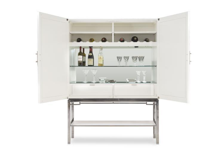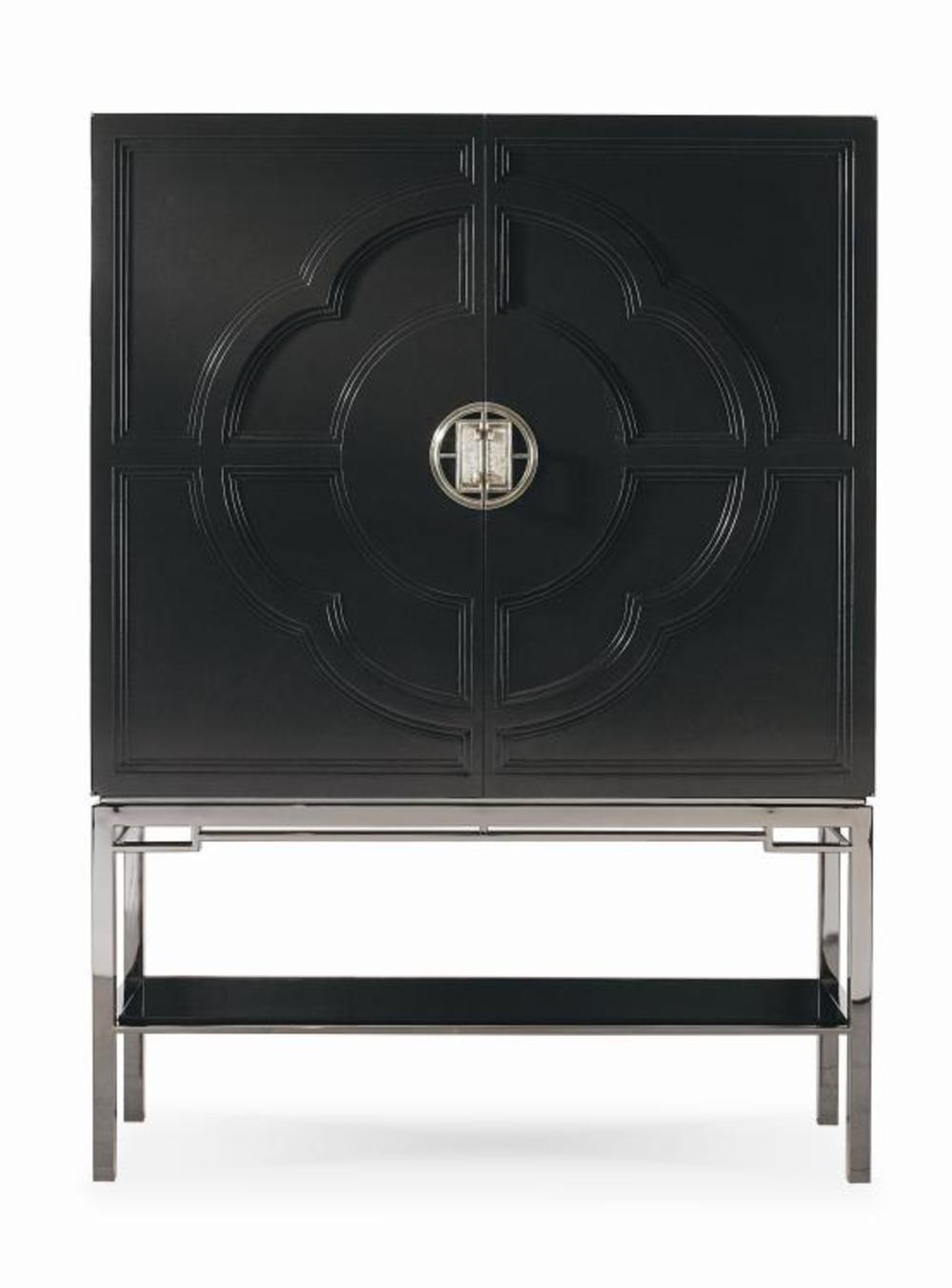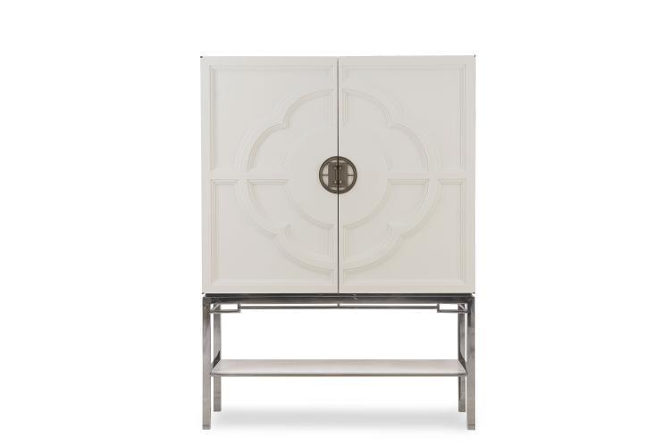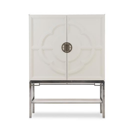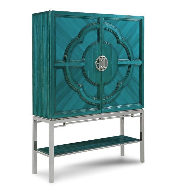The Lotus bar cabinet features two doors with a quatrefoil motif. Open the doors to show an adjustable wood shelf at the top, a shelf with wine storage, mirrored back, an adjustable glass shelf, and an open shelf that is the top of two drawers. The metal base also has an open shelf in the engaging finish on the body of the cabinet. Lotus cabinet is inspired by Asian design with carved fretwork and vibrant finishes.