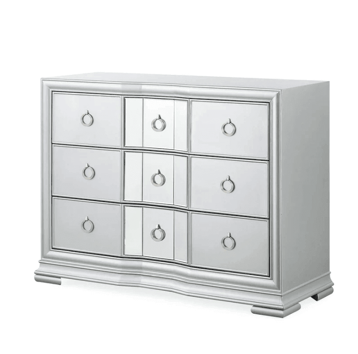 The Luciana modern three-drawer chest is a lovely addition to any living area or bedroom. The serpentine curve of the frame is created by the softly curving drawer fronts. An appealing vibe is created by a Silver colour finish made of solid hardwood. This chic style is ideal for a contemporary home makeover or an urban refresh.