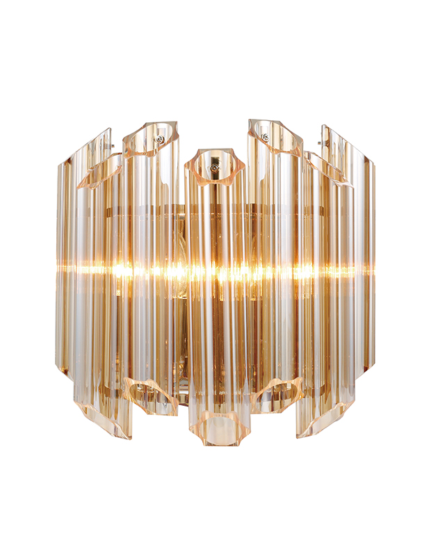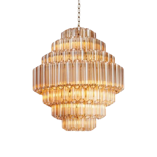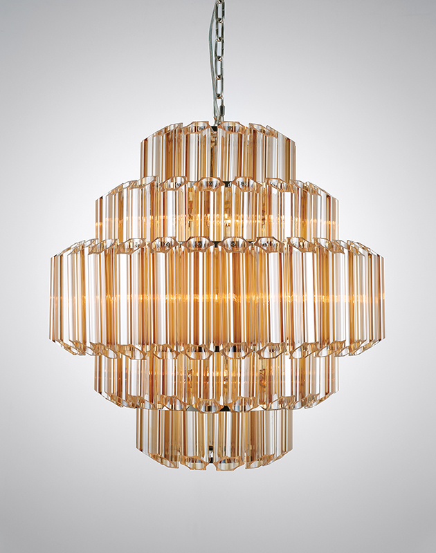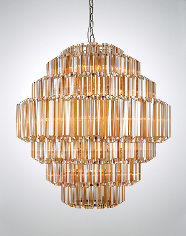 The stunning 1970s inspired Luxor chandelier is a spectacular feature piece, with delicate tubes of amber yellow glass suspended from an stainless steel frame with polished brass finish creating a diamond formation. ‘