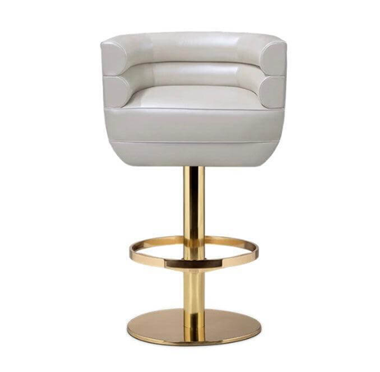 Drawing inspiration from mid-century design aesthetics, but with a contemporary look, Luxor is a posh accent bar chair with sinuous curves on its back. Supported by a round polished gold base and a footrest for comfort, Luxor is upholstered in a creamy leather and a compact design with two rolled arms.