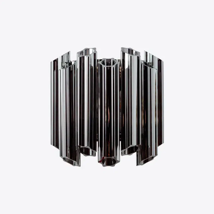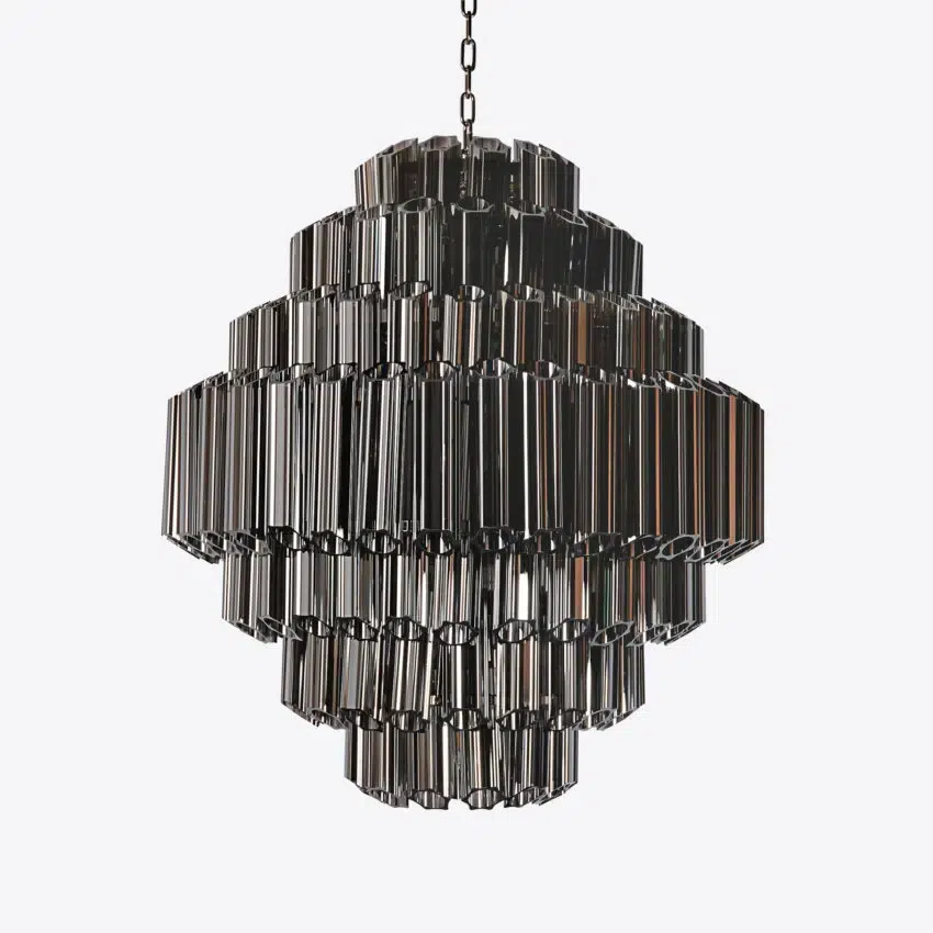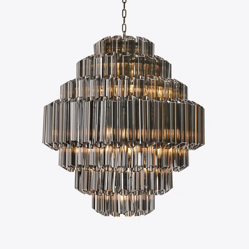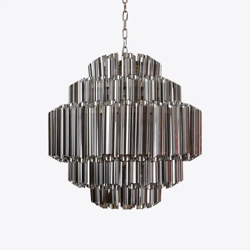 The stunning 1970s inspired Luxor chandelier is a spectacular feature piece, with delicate tubes of smoked crystal glass suspended from an polished nickel frame creating a diamond formation.