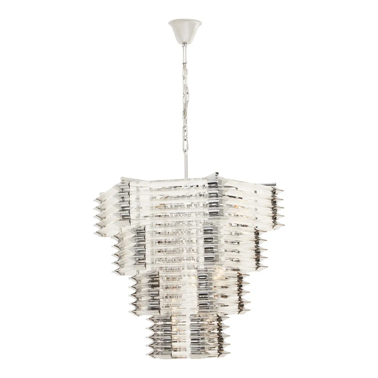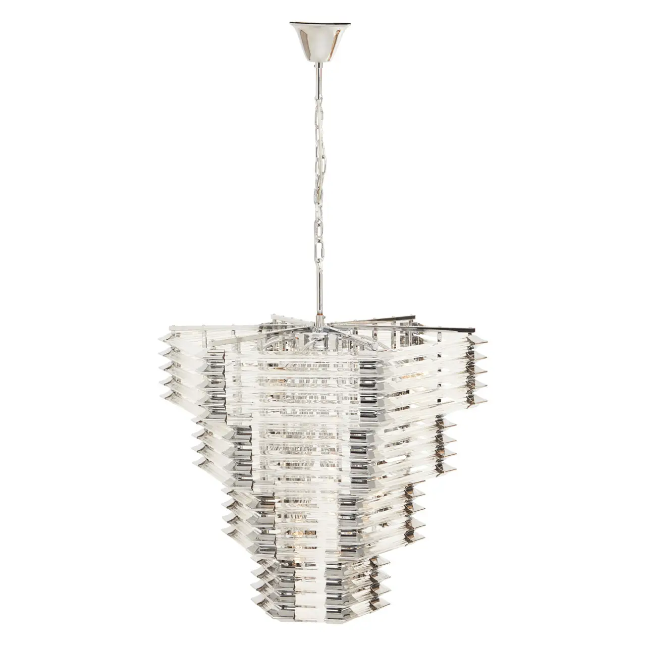 Lystra Crystal Nickel Chandelier. Elegant vintage-style ceiling lamp with a polished nickel finished metal frame and beautiful crystals that give the piece a hexagonal shape. This chandelier consists clear glass prisms on a large frame. Featuring a transitional polished nickel finish for a decorative effect, this chandelier casts multidirectional light, glass and chrome finish chandelier features dazzling crystal drops with fifteen bulbs.