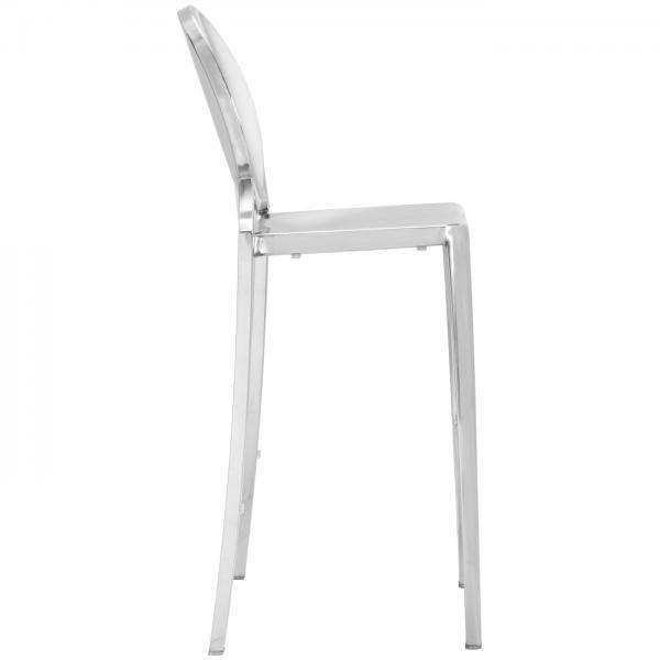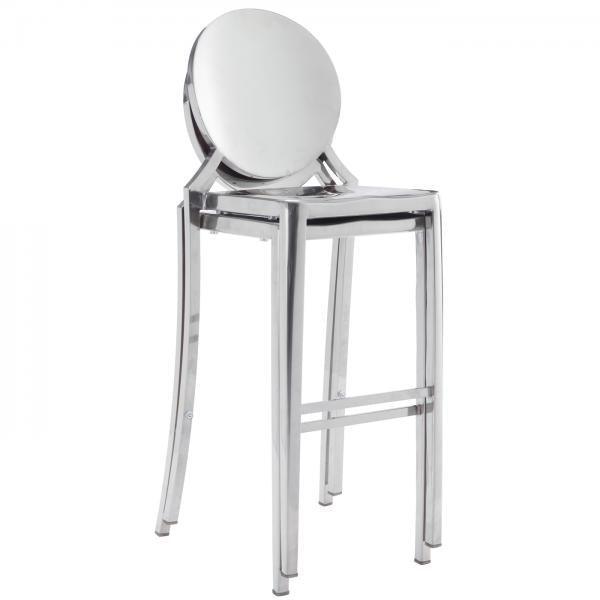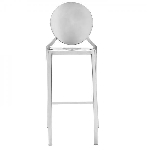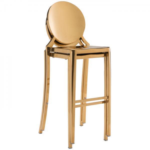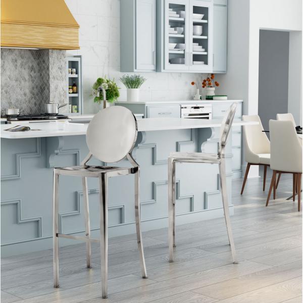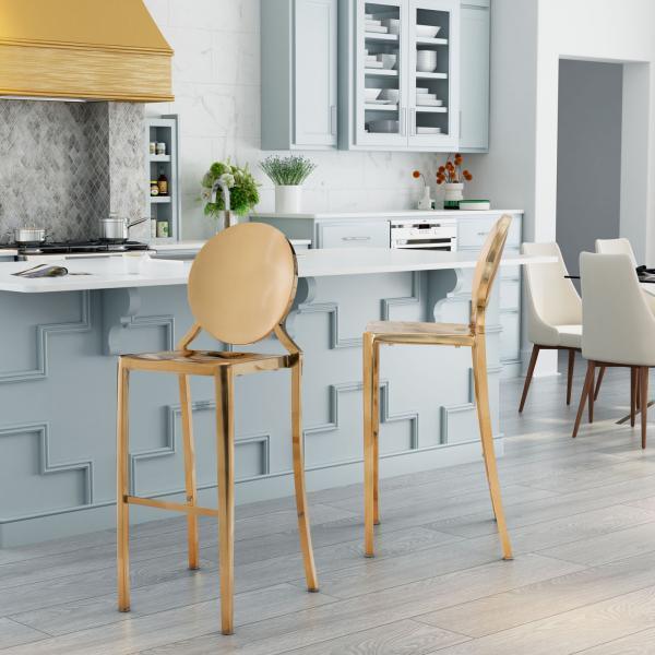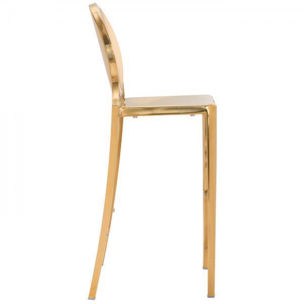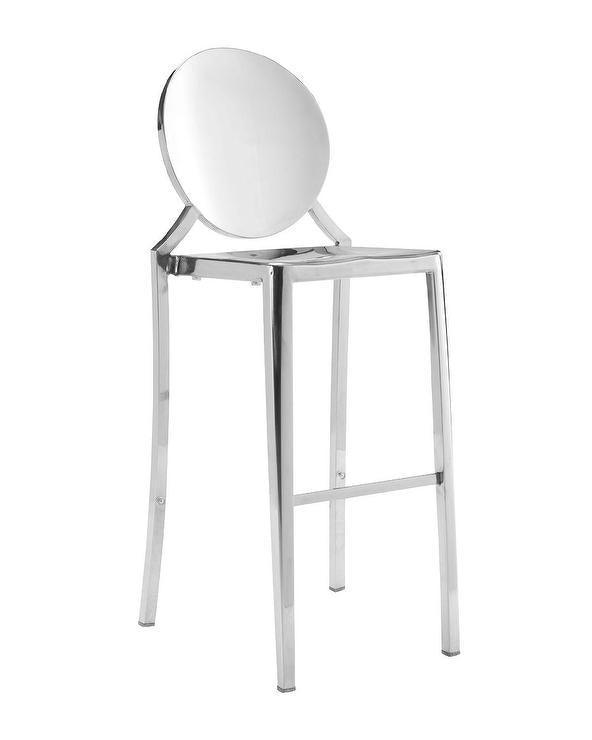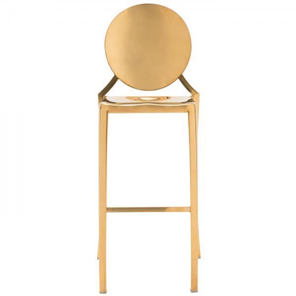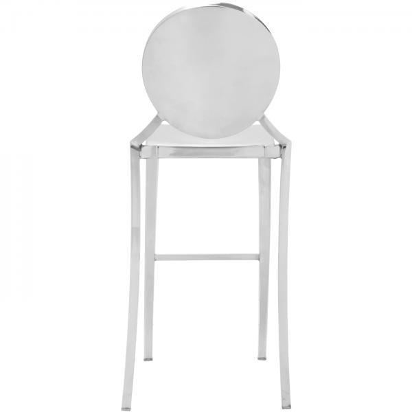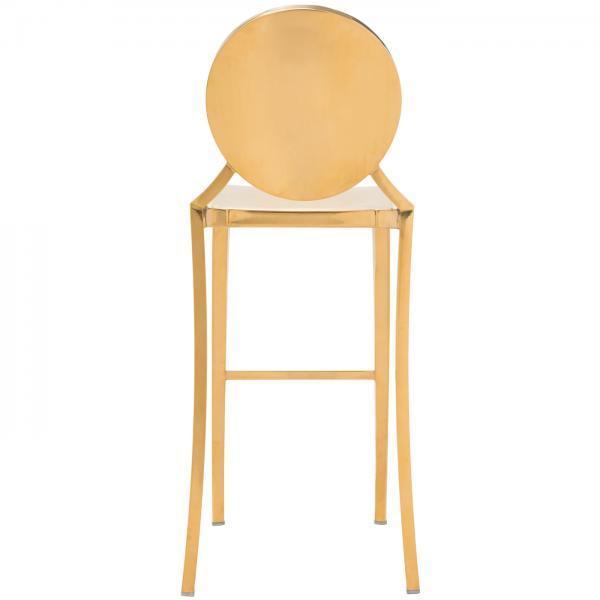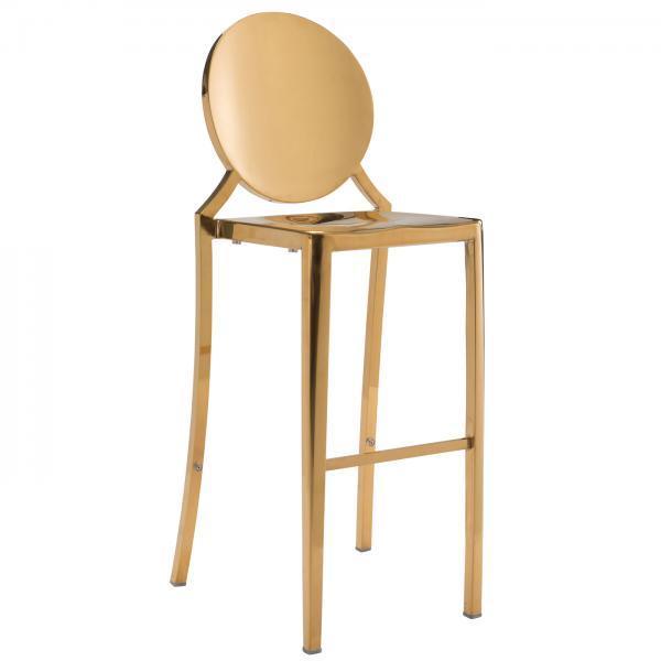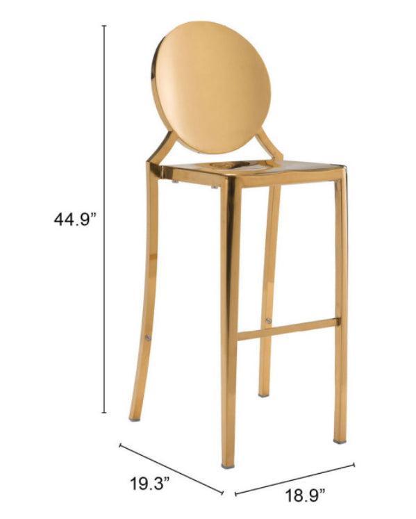 A modern style bar stool with sleek modern silhouette, classic shape of french design, seat and round back in silver stainless steel or gold finish. The Maddox Bar stool uses the spirit of a classic French design then unites a sleek modern inspiration to create a very nice stool. Polished Stainless steel finishing seamlessly from top to bottom, seat and round back. This graceful dining chair makes a stunning addition to any home, bar, or restaurant. Sold separately the collection includes dining, bar and counter series in either Chrome finish Stainless steel or Gold.