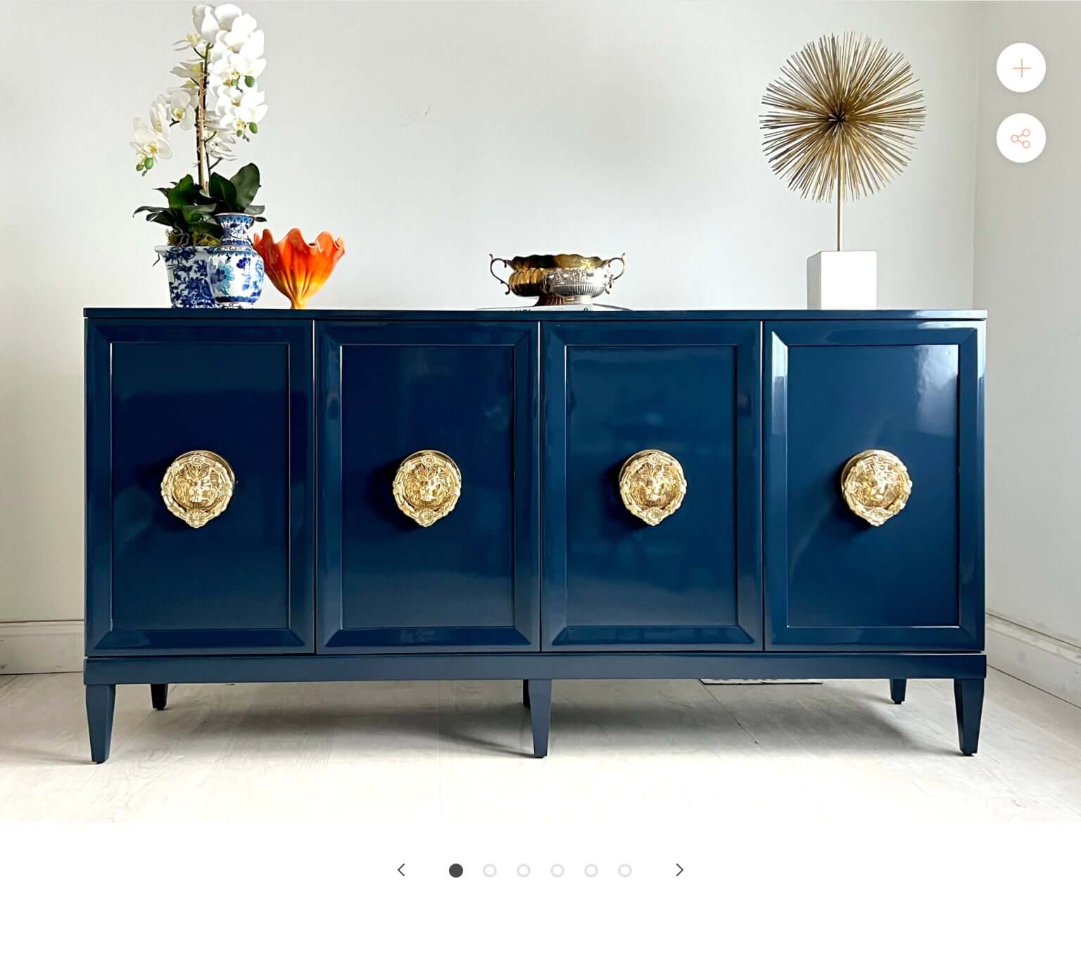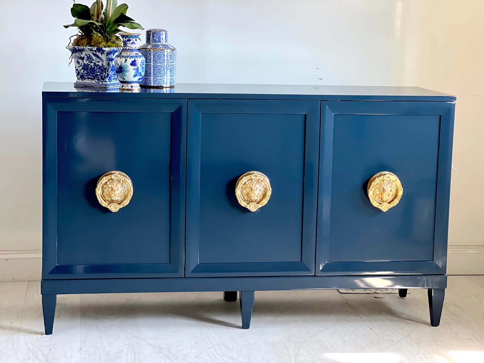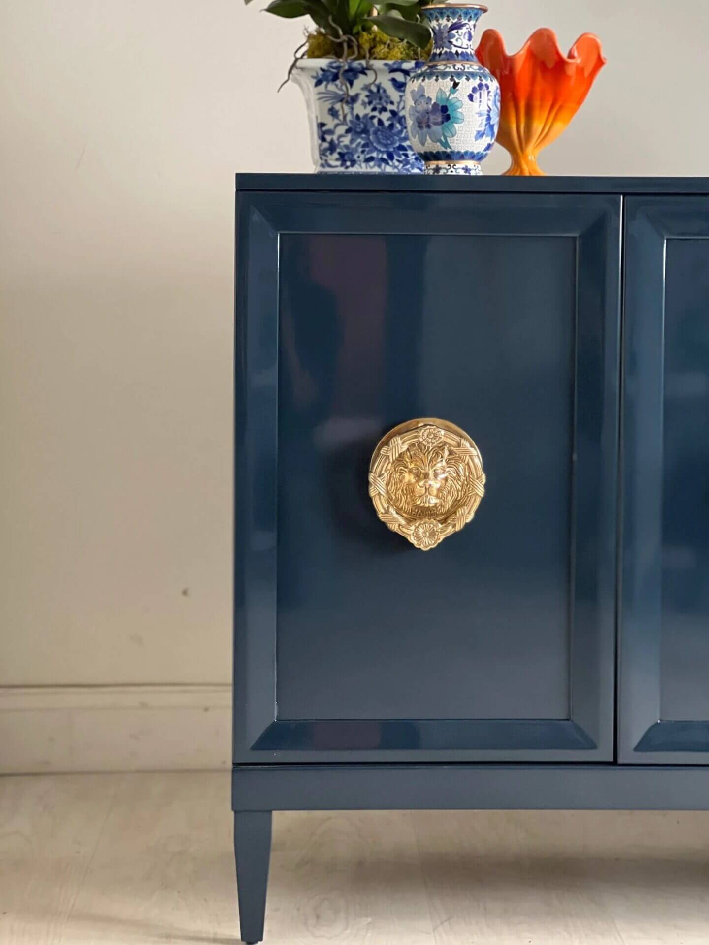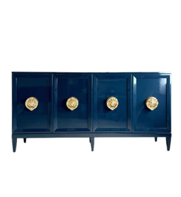 New Modern Buffet Credenza made with solid hardwood and finished in dark blue lacquer finish with brass lion head hardware.