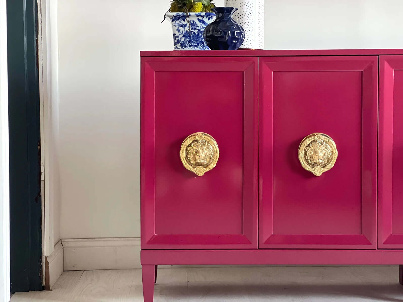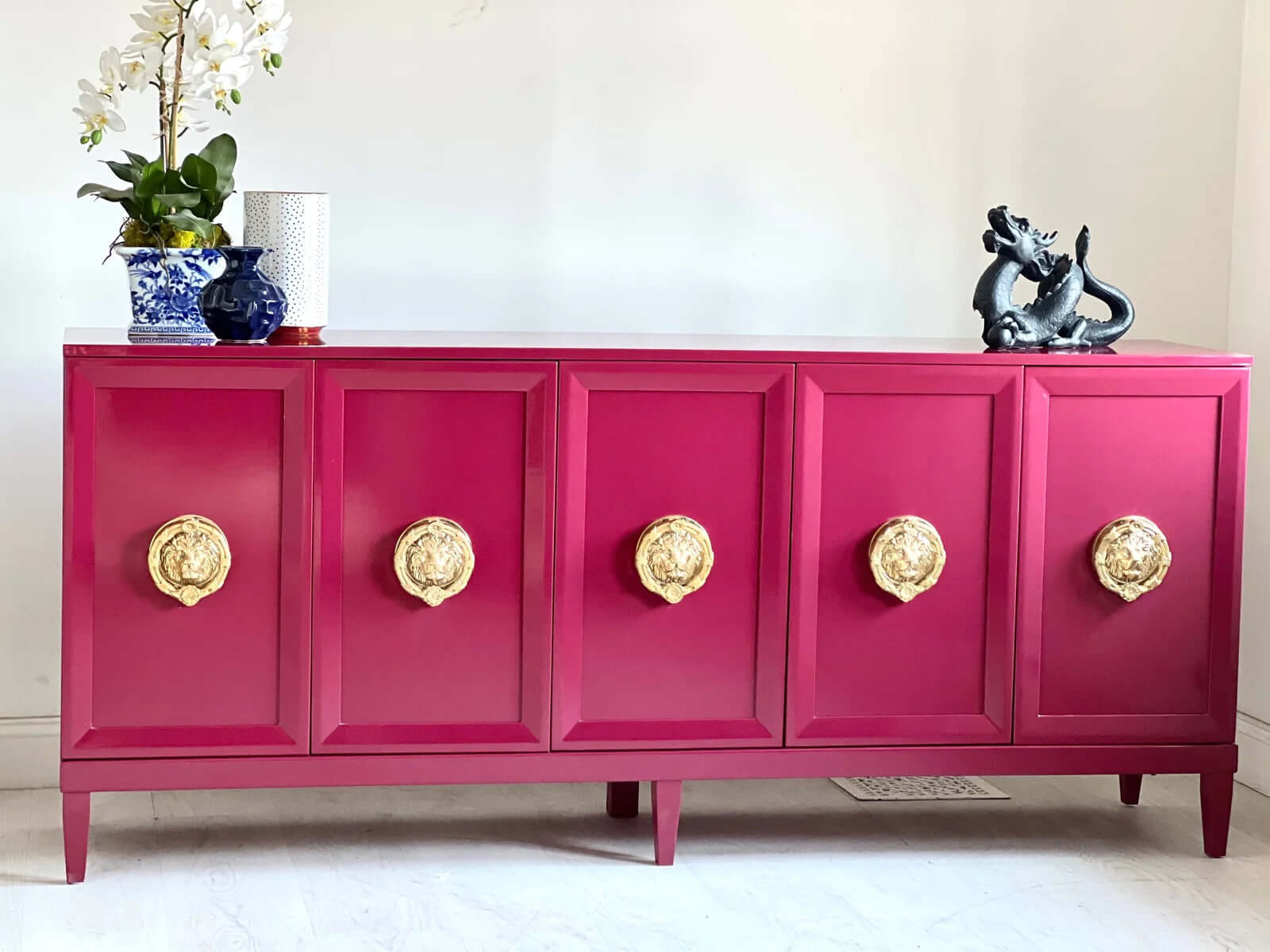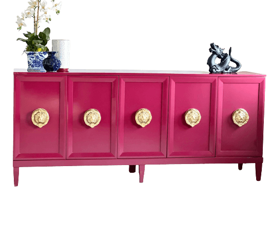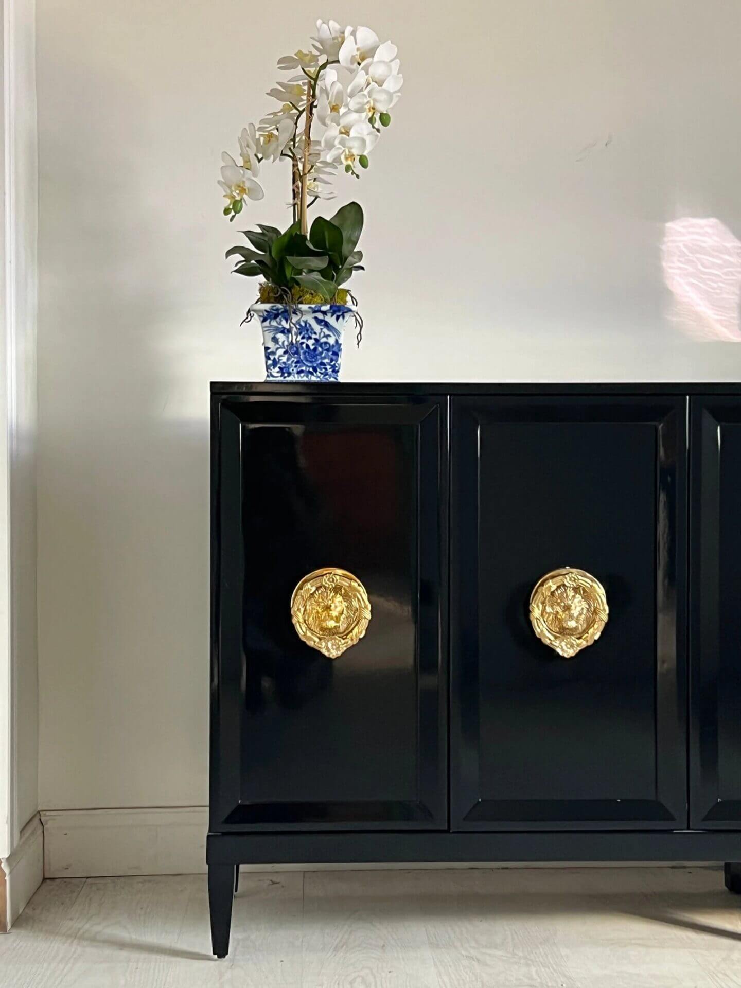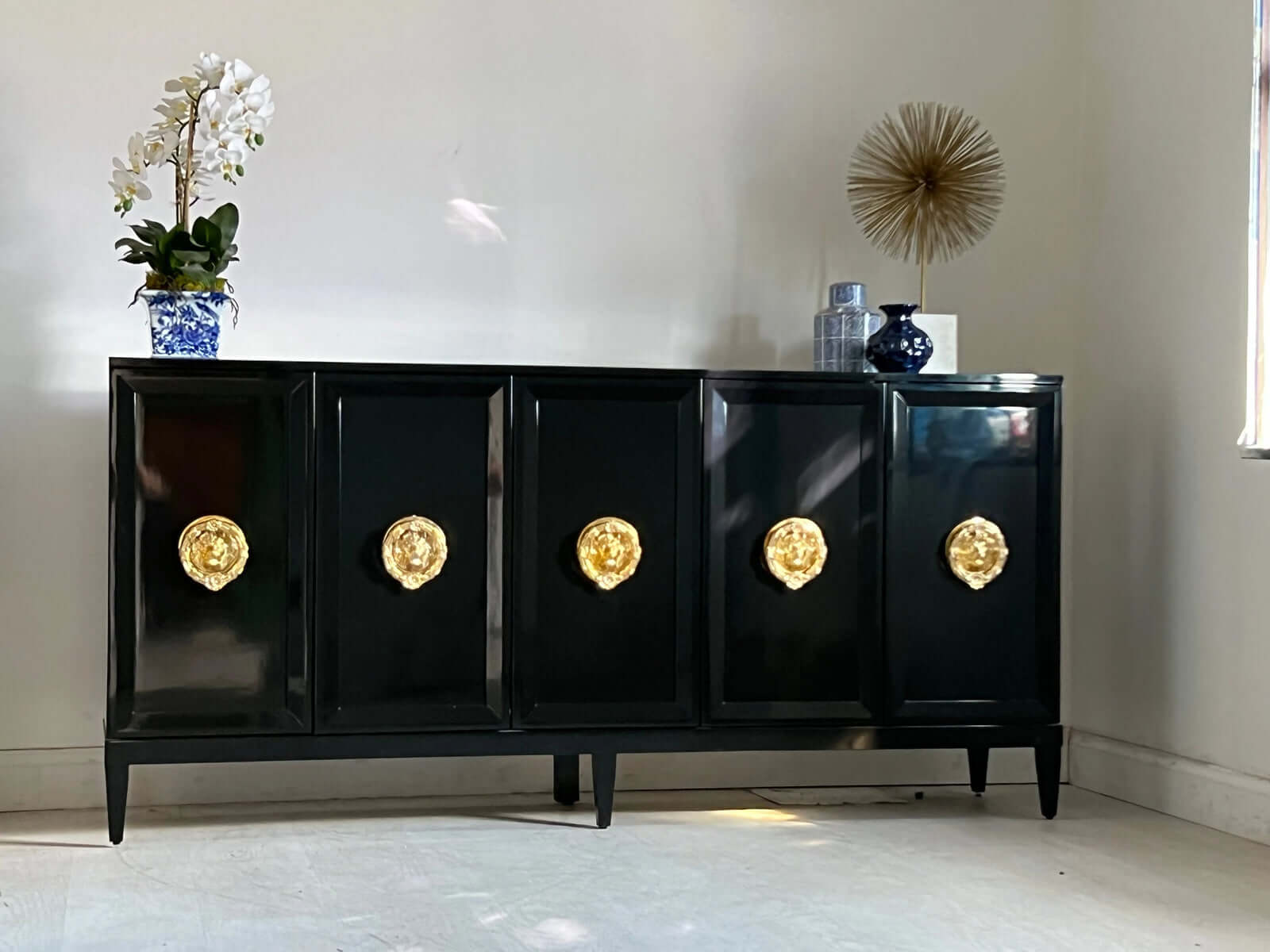 New Modern Buffet Credenza made with solid hardwood and finished in dark blue lacquer finish with brass lion head hardware.