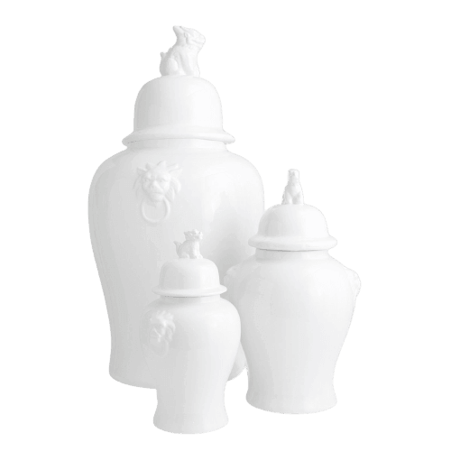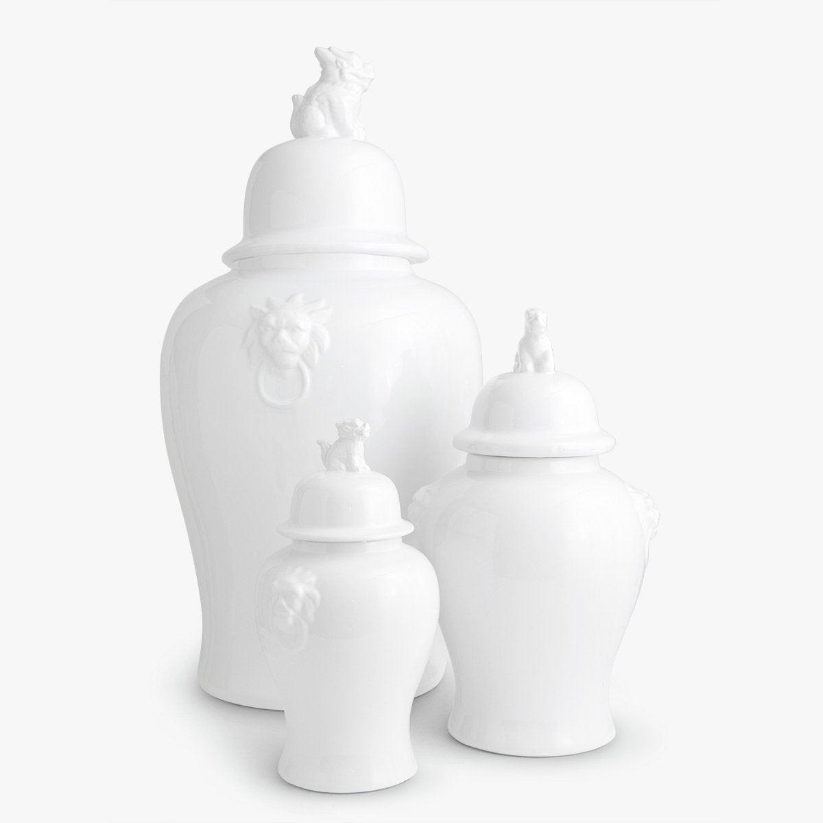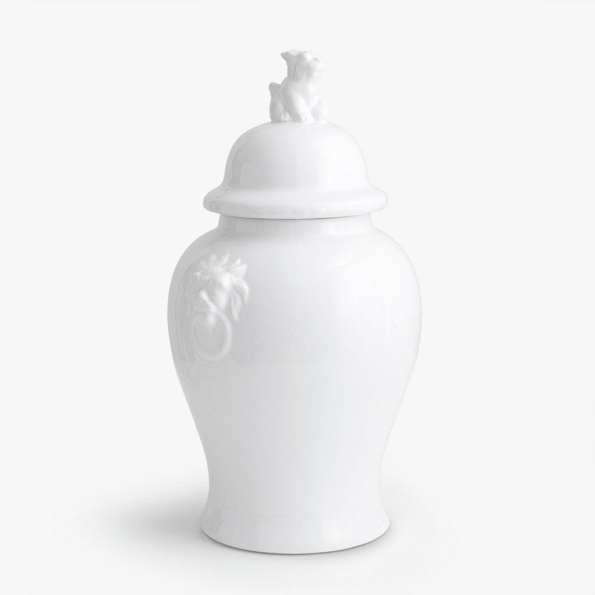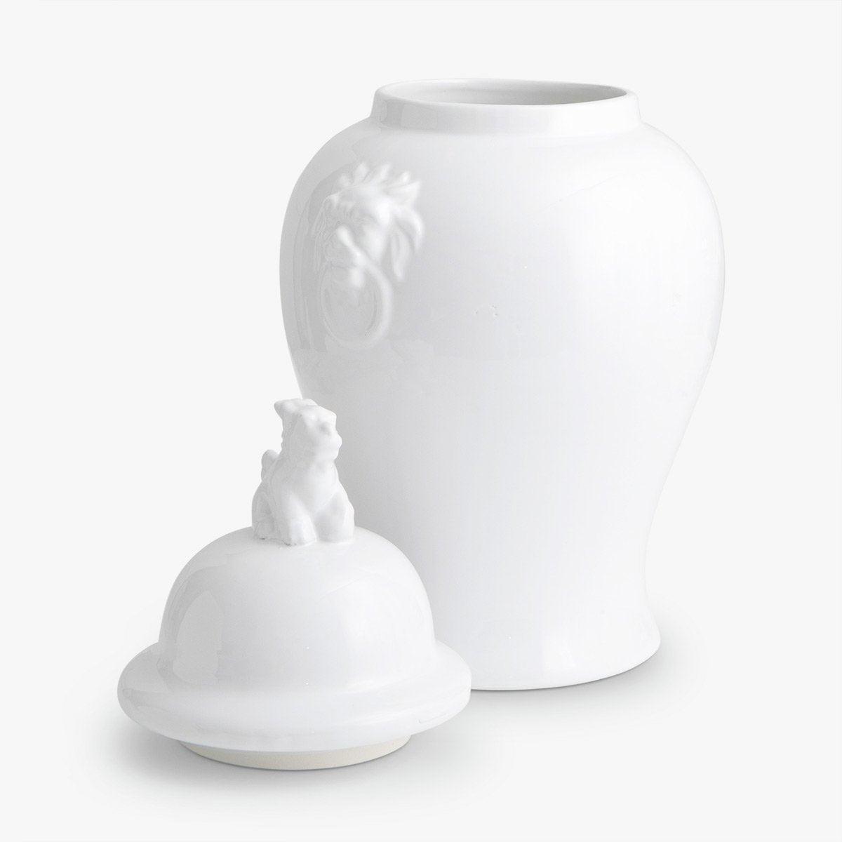 The stunning Majestic vase set features raised lion heads on either side and a gorgeously crafted three-dimensional fudog on the lid. The bold design is beautifully complemented by the classic and elegant silhouette and white ceramic gloss finish.