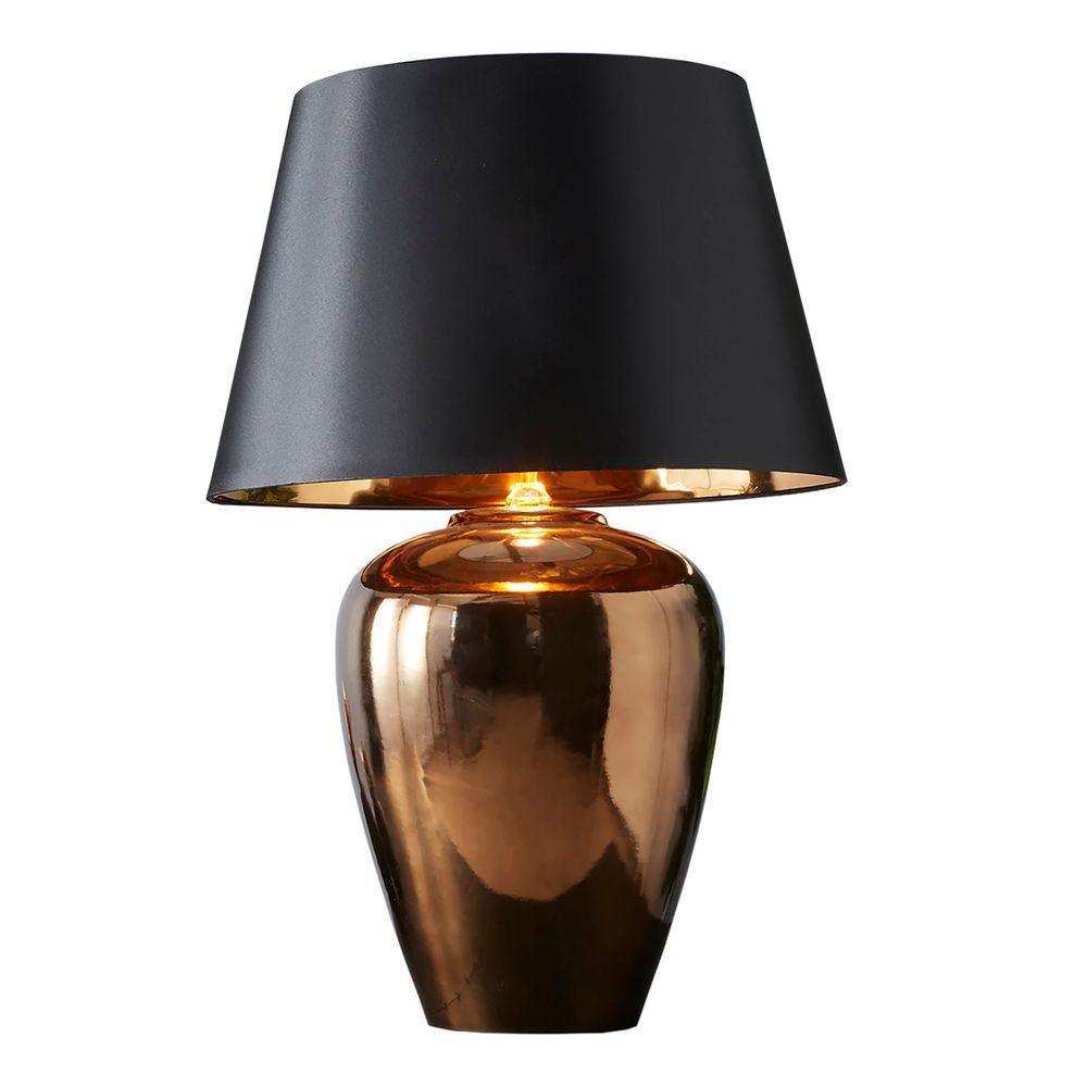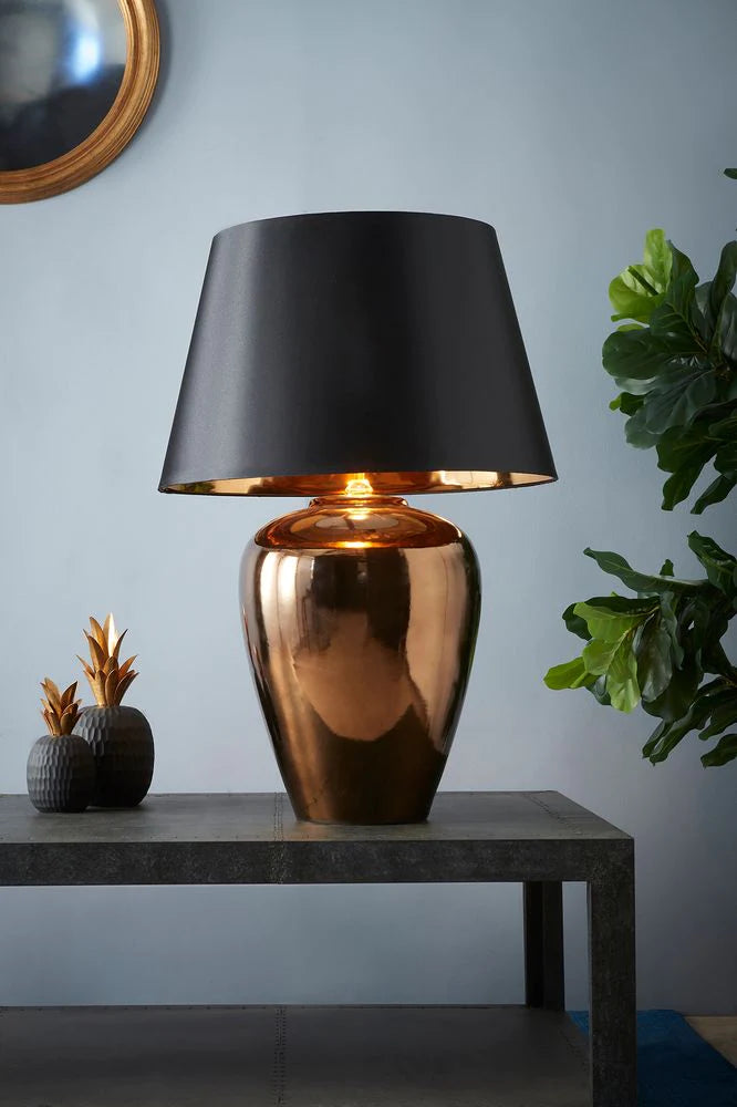 This unique Table Lamp oozes style and sophistication, providing illumination with its unique aesthetic, is a trendy decorative piece during the day and an essential source of ambient lighting by night, representing the expressive language of modern and contemporary architecture. A stunning contemporary ceramic urn table lamp, finished with a high gloss metallic glaze, and a colour matched foil lined black satin shade.